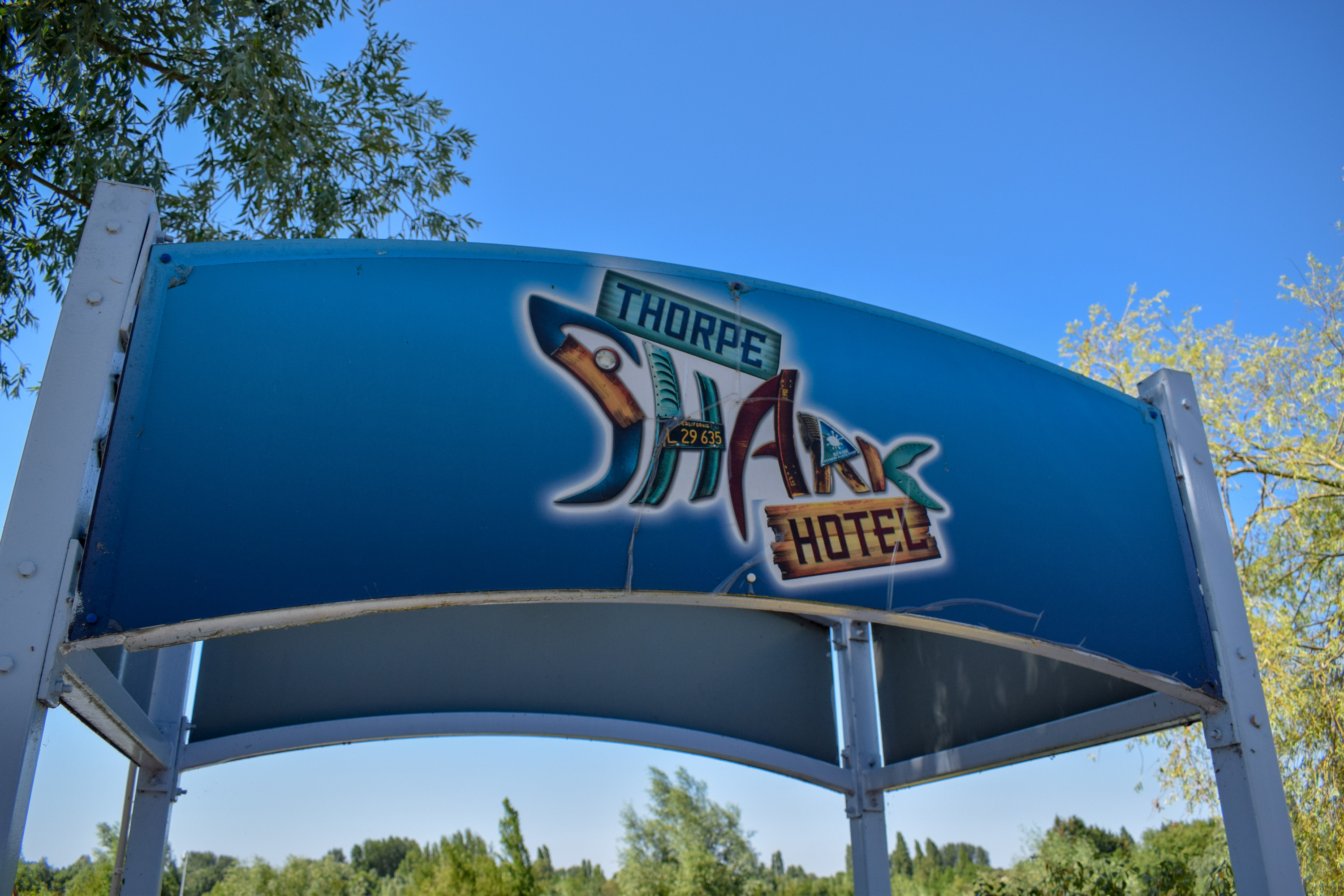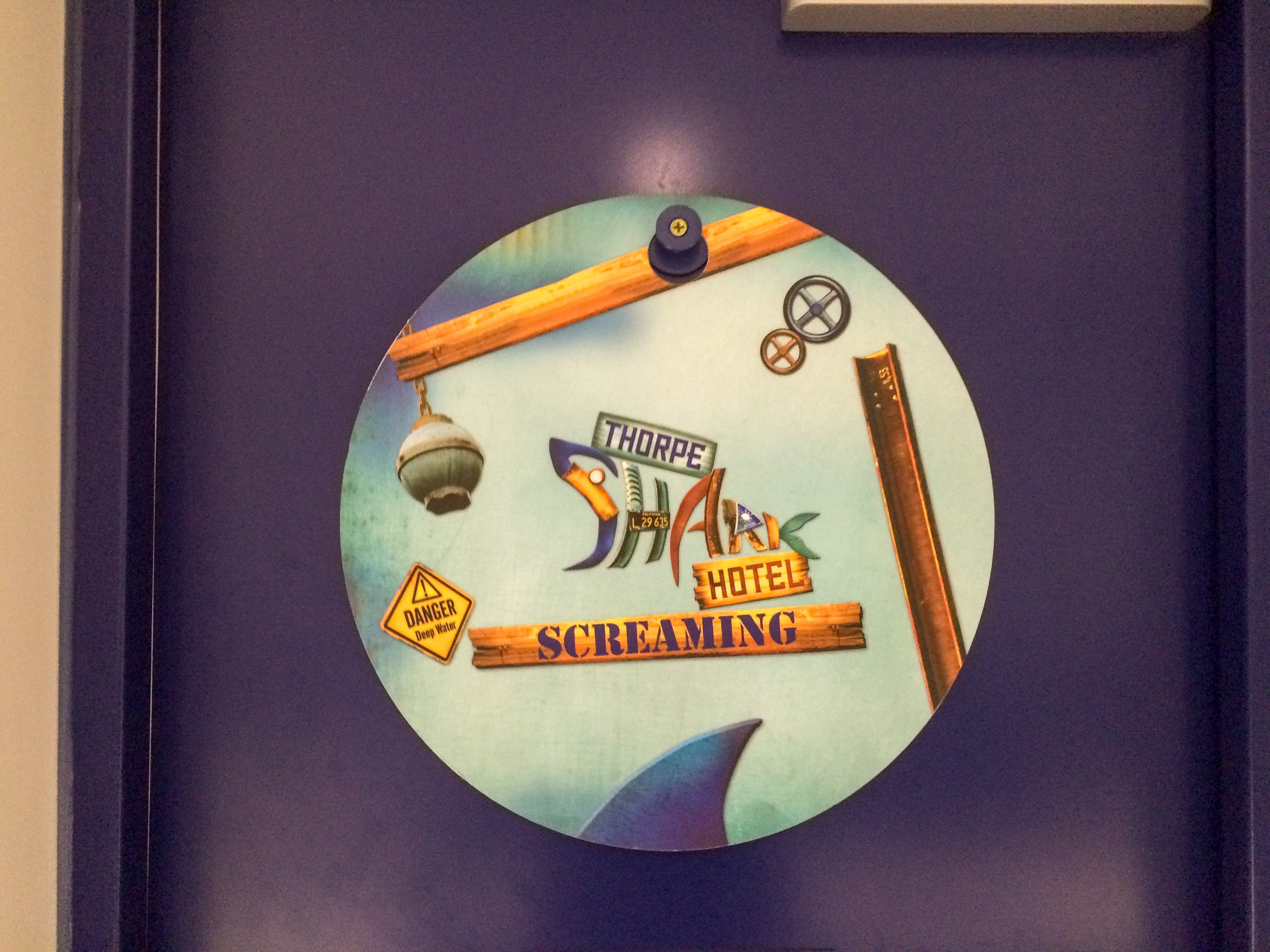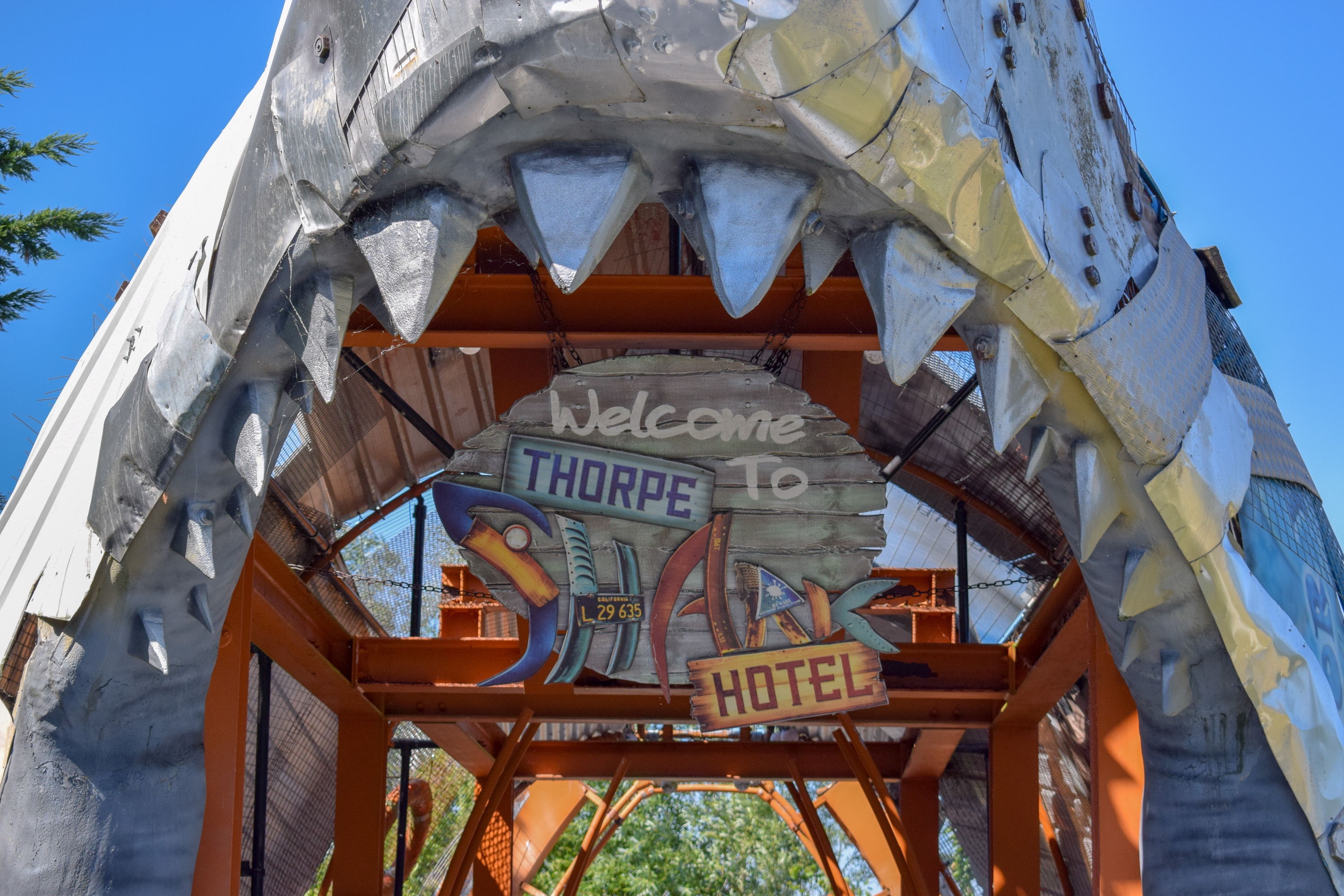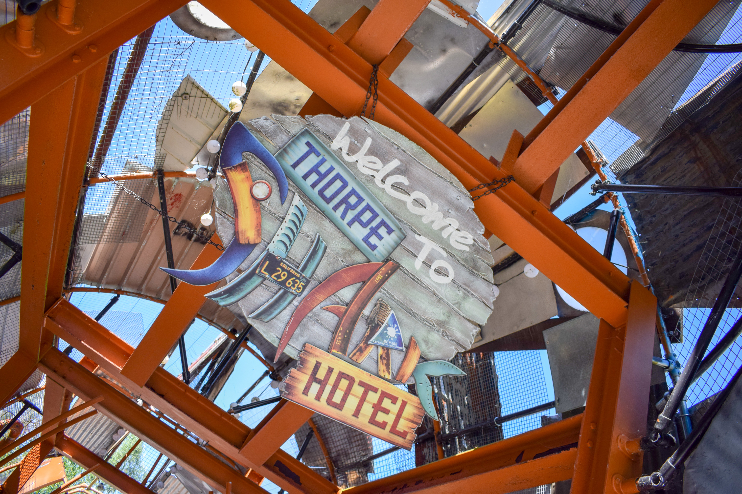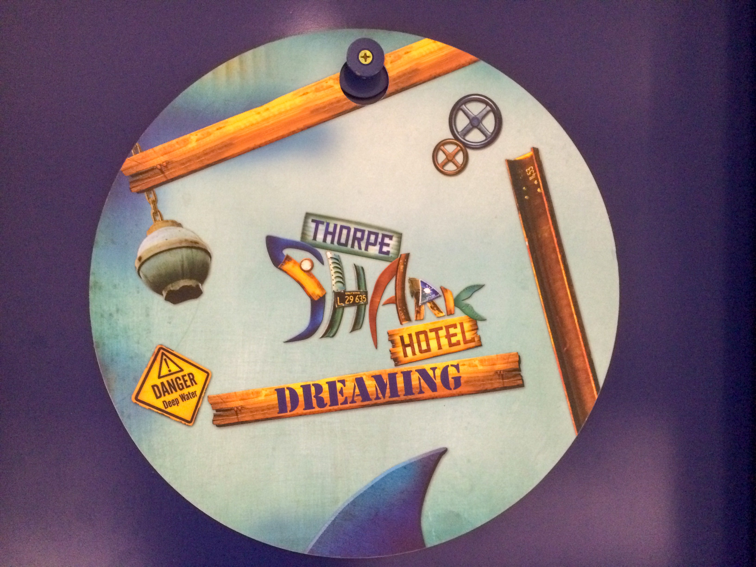 The Thorpe Shark Cabins is Thorpe Parks first accommodation option for the resort. Originally called The Crash Pad, the hotel was added as a temporary option whilst plans for a purpose-built hotel. The plans for this hotel fizzled out over time and Thorpe Park decided to make the area look more permanent so themed The Crash Pad to fit with the Island theme with Surfboards, Fishing Nets and a giant shark sculpture made from signs from Thorpe's past. The hotel is provided by a company called Snooze Box who offers "pop up" sleeping arrangements for Festivals. In 2020, the Thorpe Shark Hotel was rebranded to Thorpe Shark Cabins.