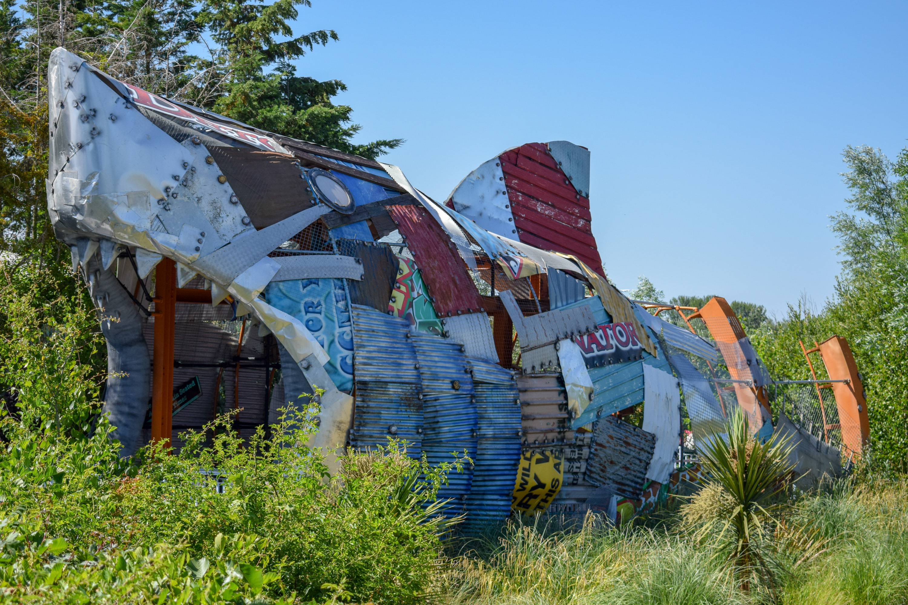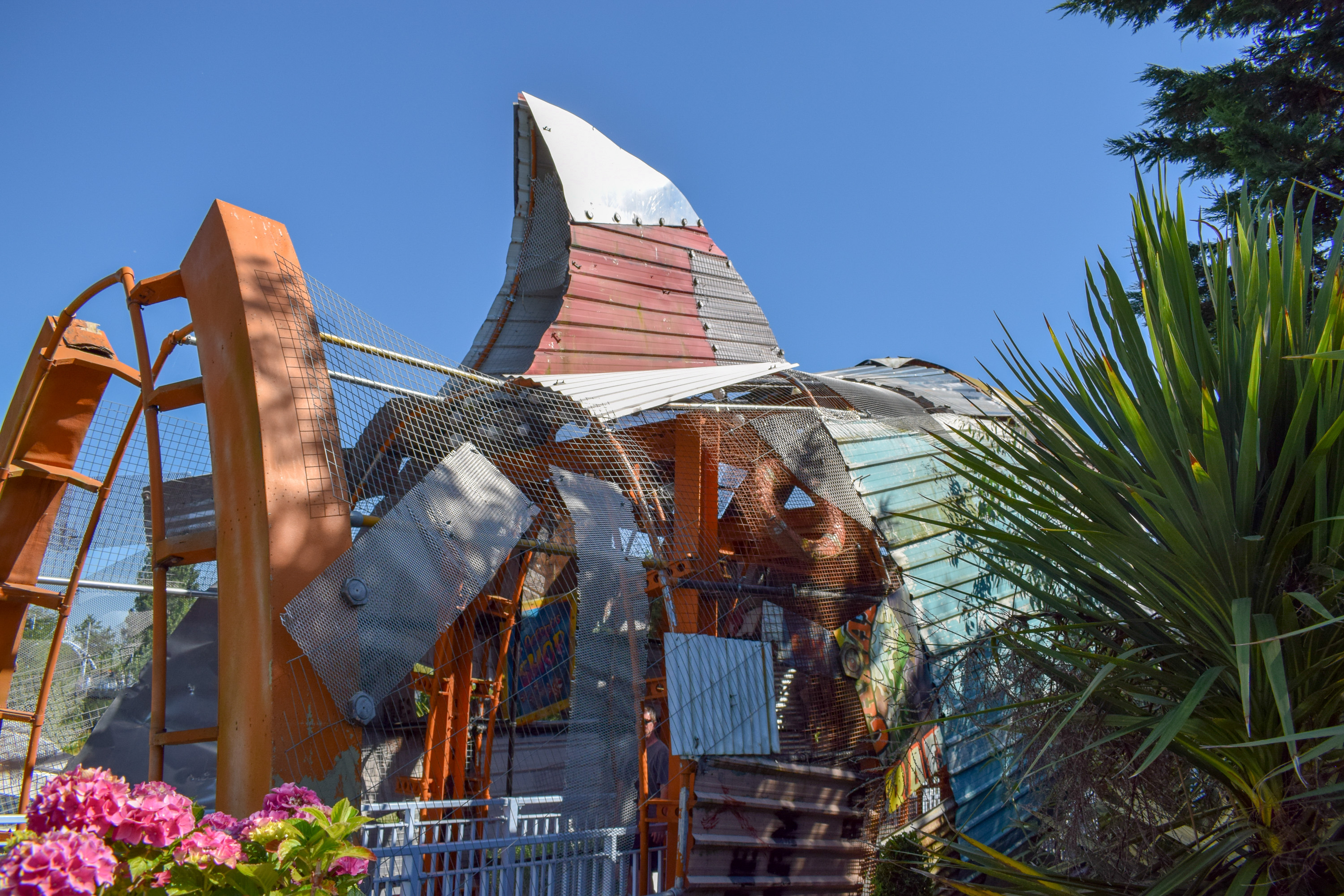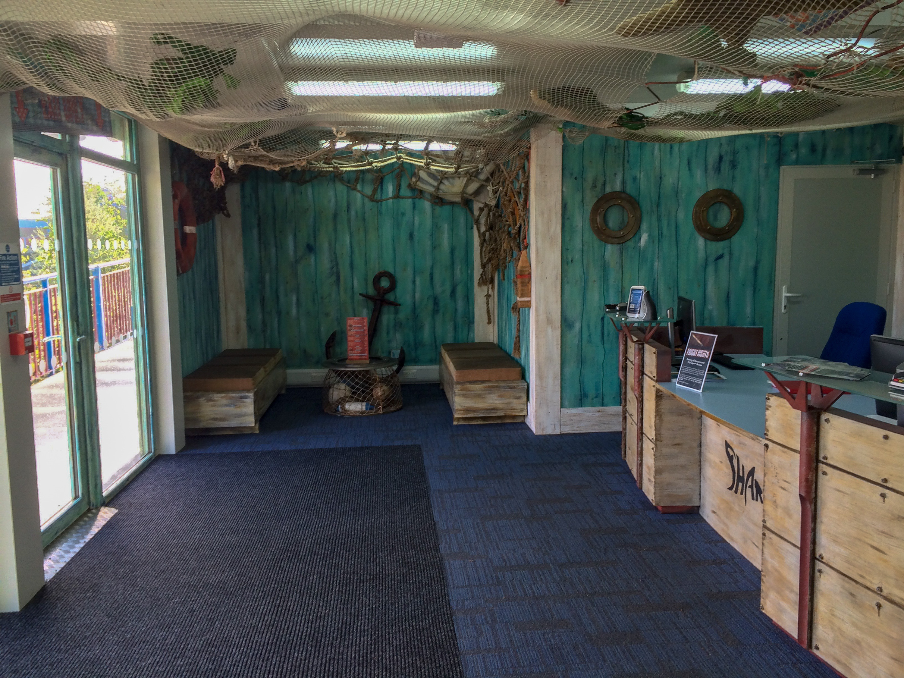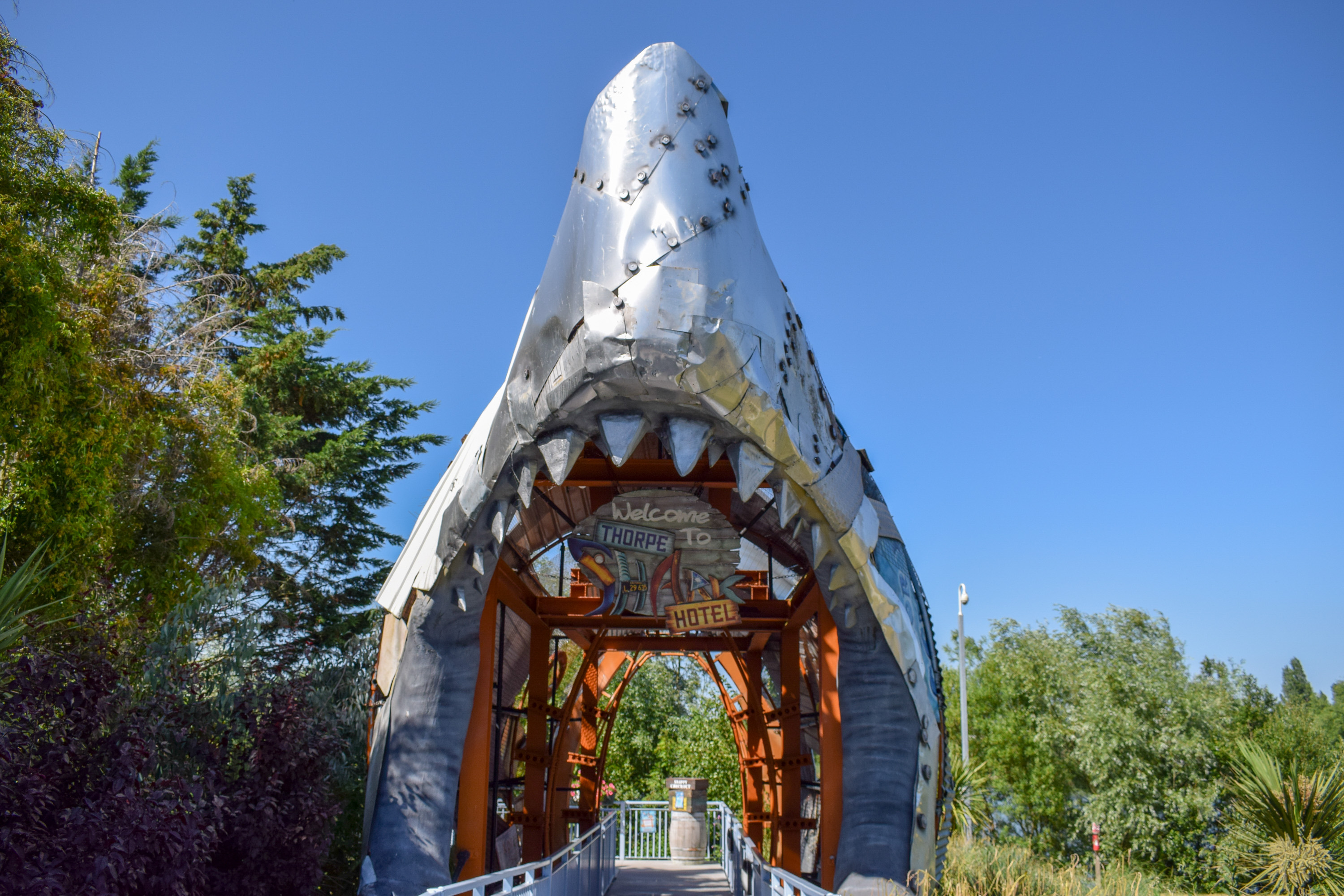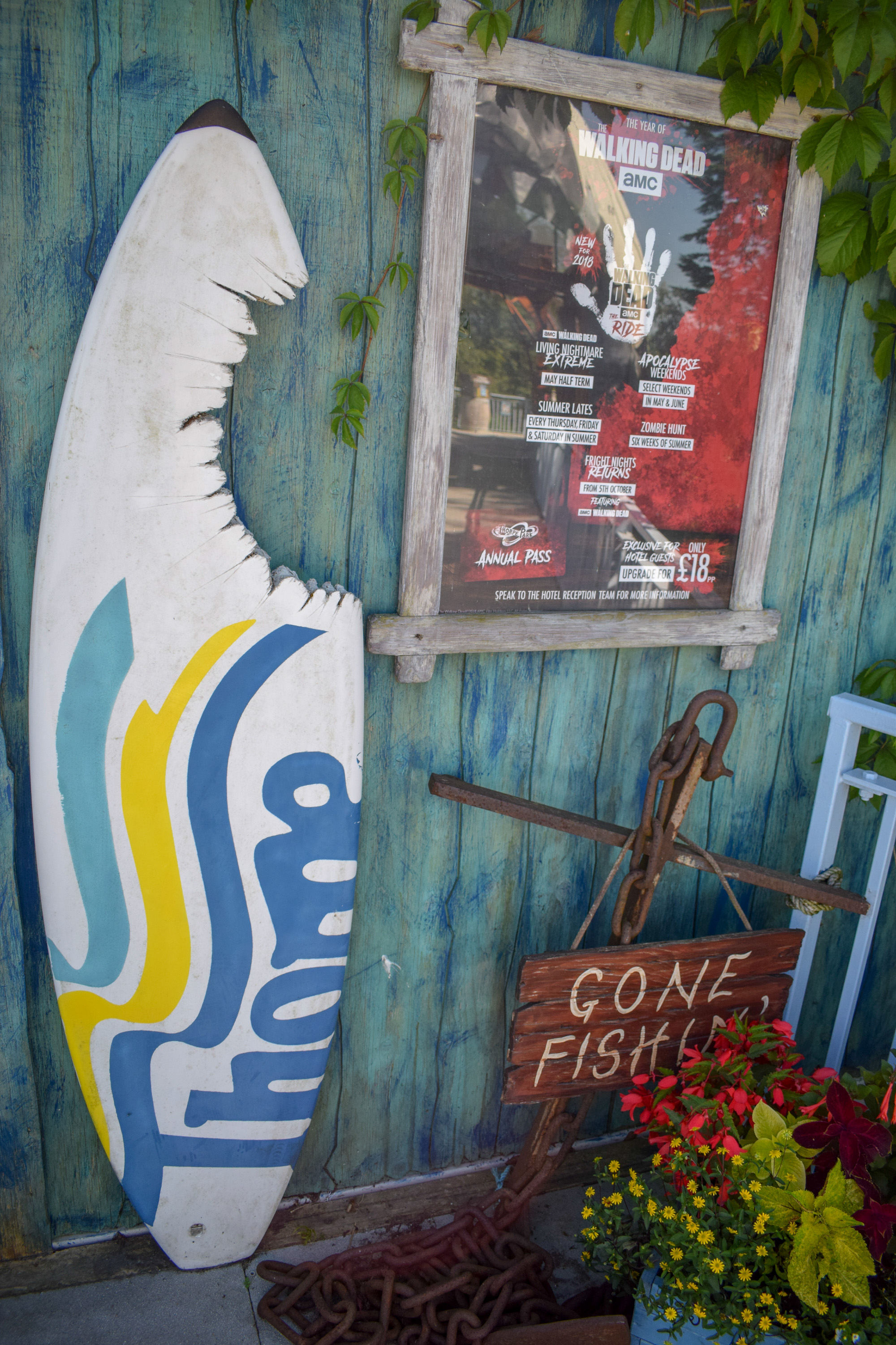 The Thorpe Shark Cabins is Thorpe Parks first accommodation option for the resort. Originally called The Crash Pad, the hotel was added as a temporary option whilst plans for a purpose-built hotel. The plans for this hotel fizzled out over time and Thorpe Park decided to make the area look more permanent so themed The Crash Pad to fit with the Island theme with Surfboards, Fishing Nets and a giant shark sculpture made from signs from Thorpe's past. The hotel is provided by a company called Snooze Box who offers "pop up" sleeping arrangements for Festivals. In 2020, the Thorpe Shark Hotel was rebranded to Thorpe Shark Cabins.