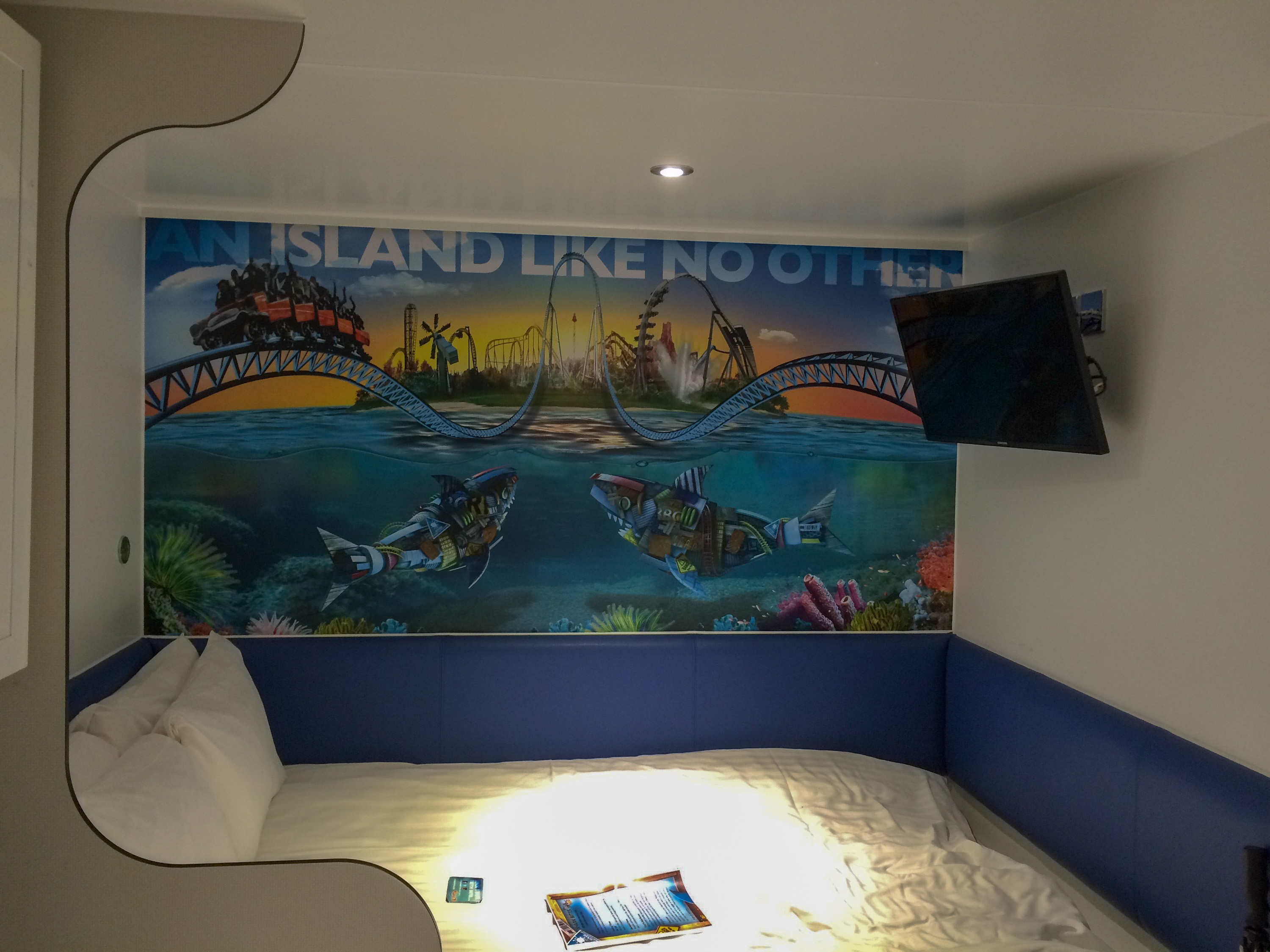 The rooms consist of a Double bed and a bunk bed arrangement (however the top bunk in folded in when not required) and has a TV (with a range of Freeview channels) with interactive apps such as Youtube and Spotify as well as games such as Angry Birds.