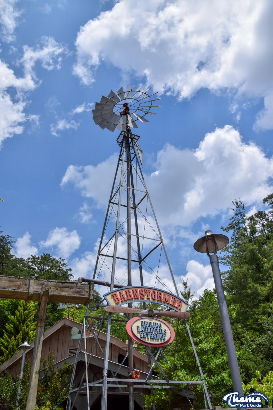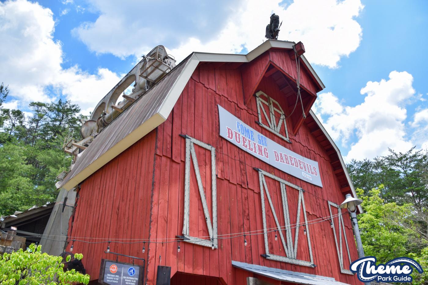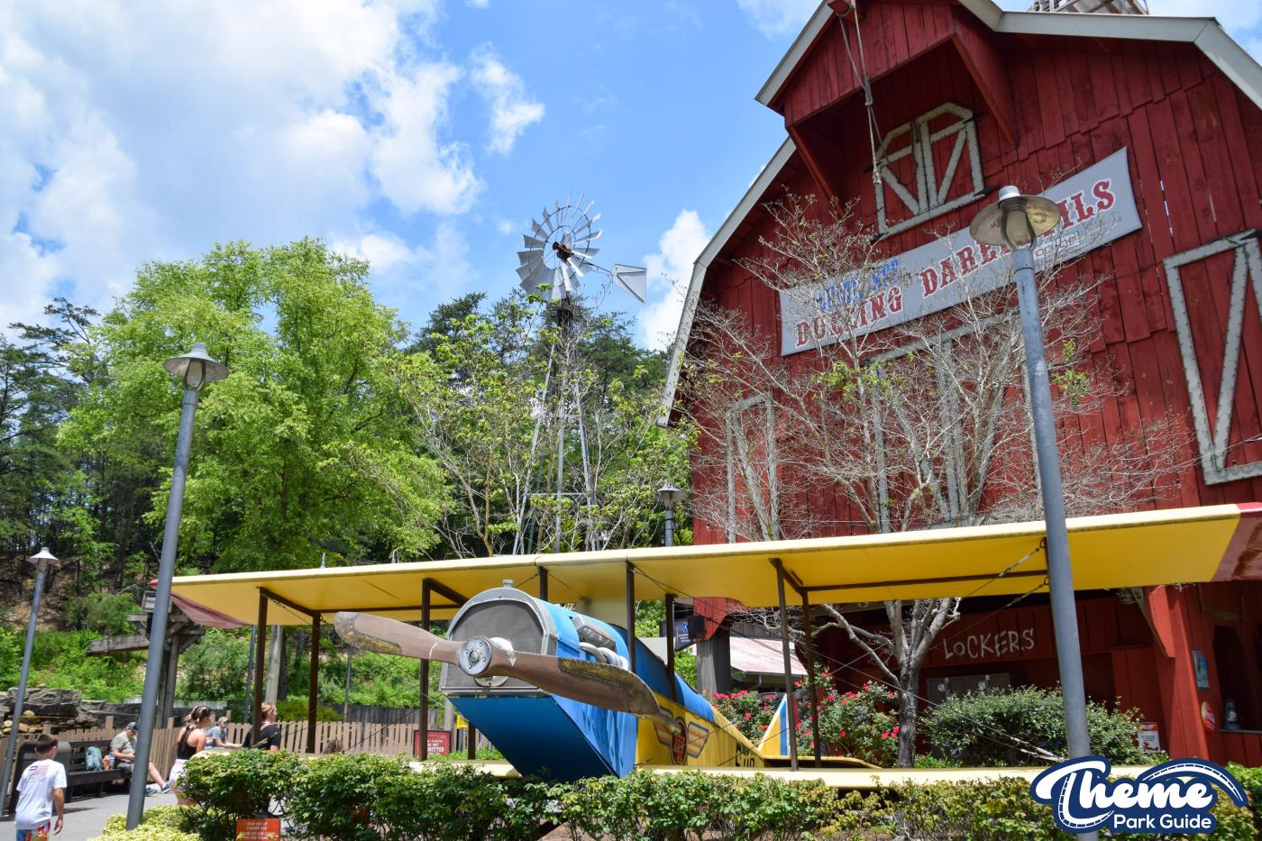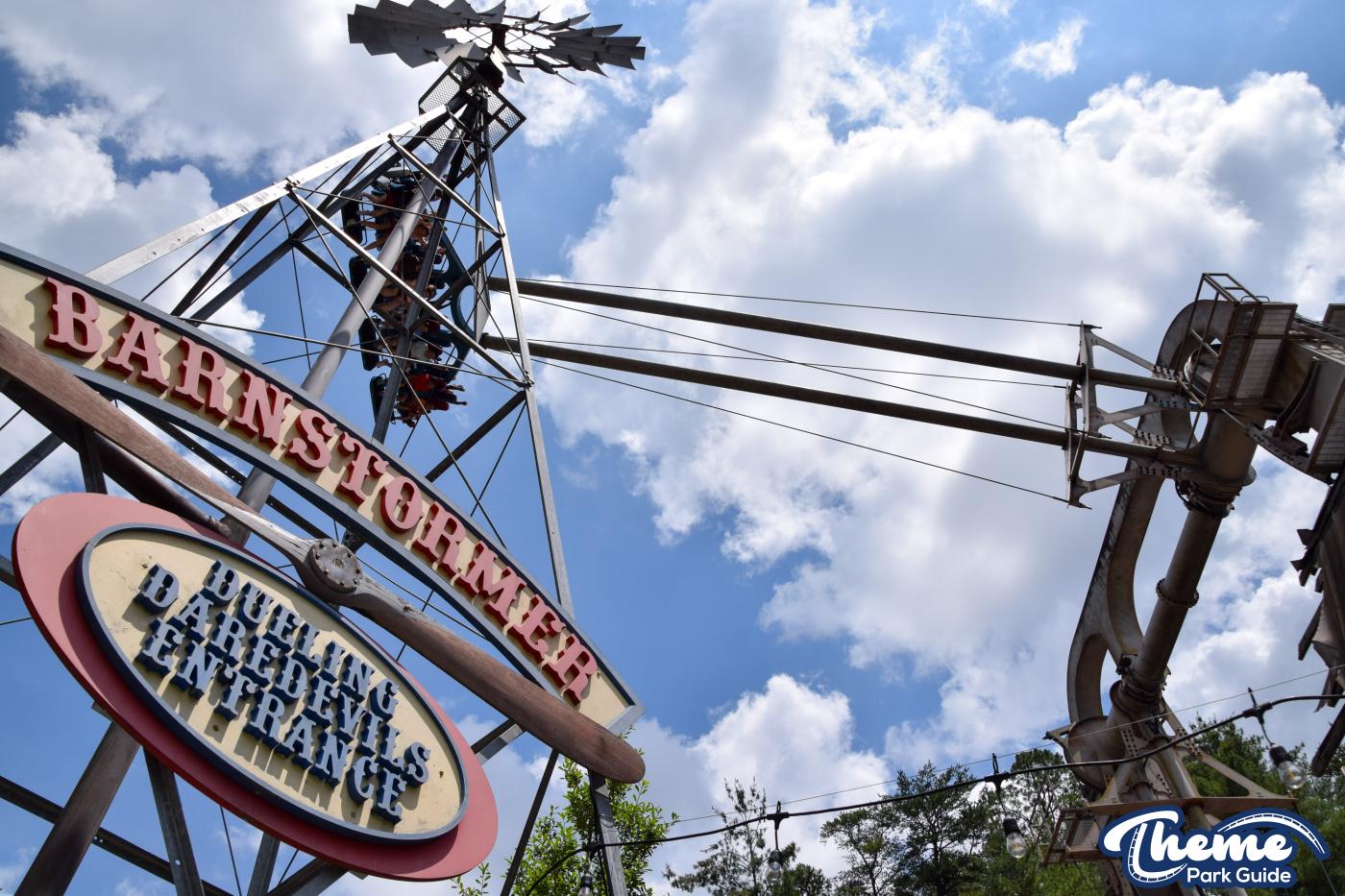 Barnstormer is a high-flying pendulum ride themed around vintage stunt pilots and daring aerial maneuvers. Located in Owens Farm, it sends riders soaring up to impressive heights while swinging back and forth with increasing speed. The open-air design and barnyard theming create a thrilling yet charming experience, offering sweeping views of the surrounding foothills.