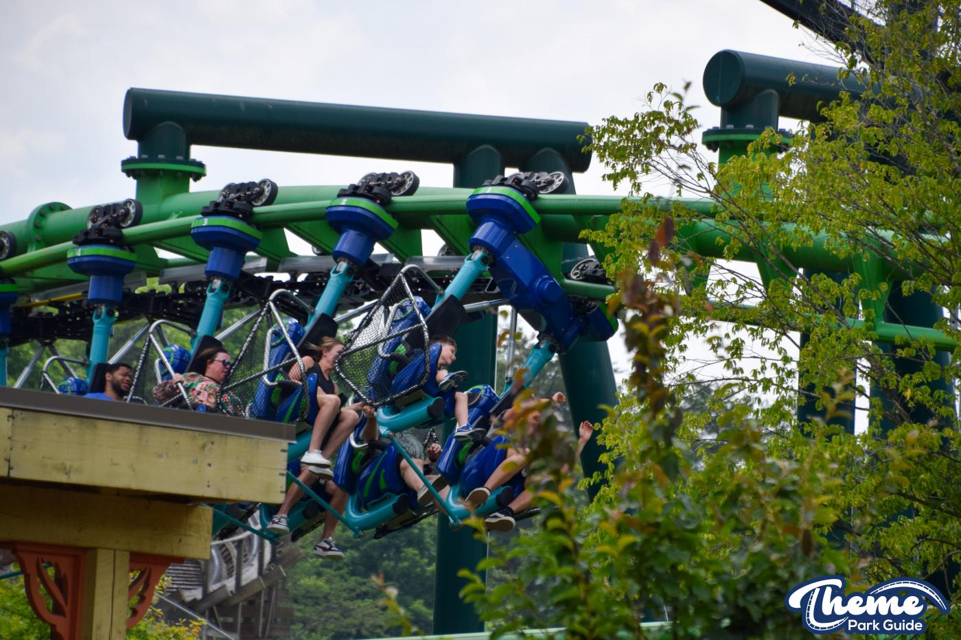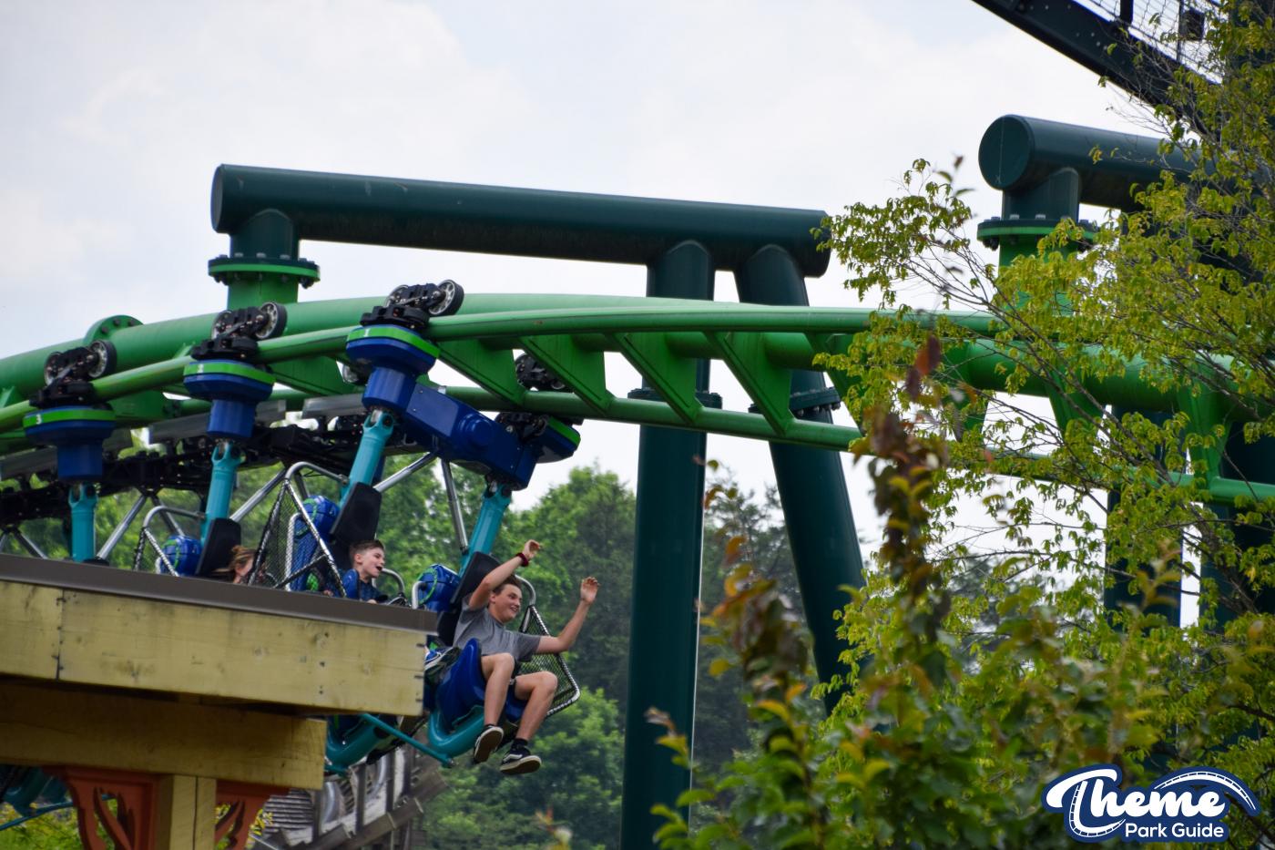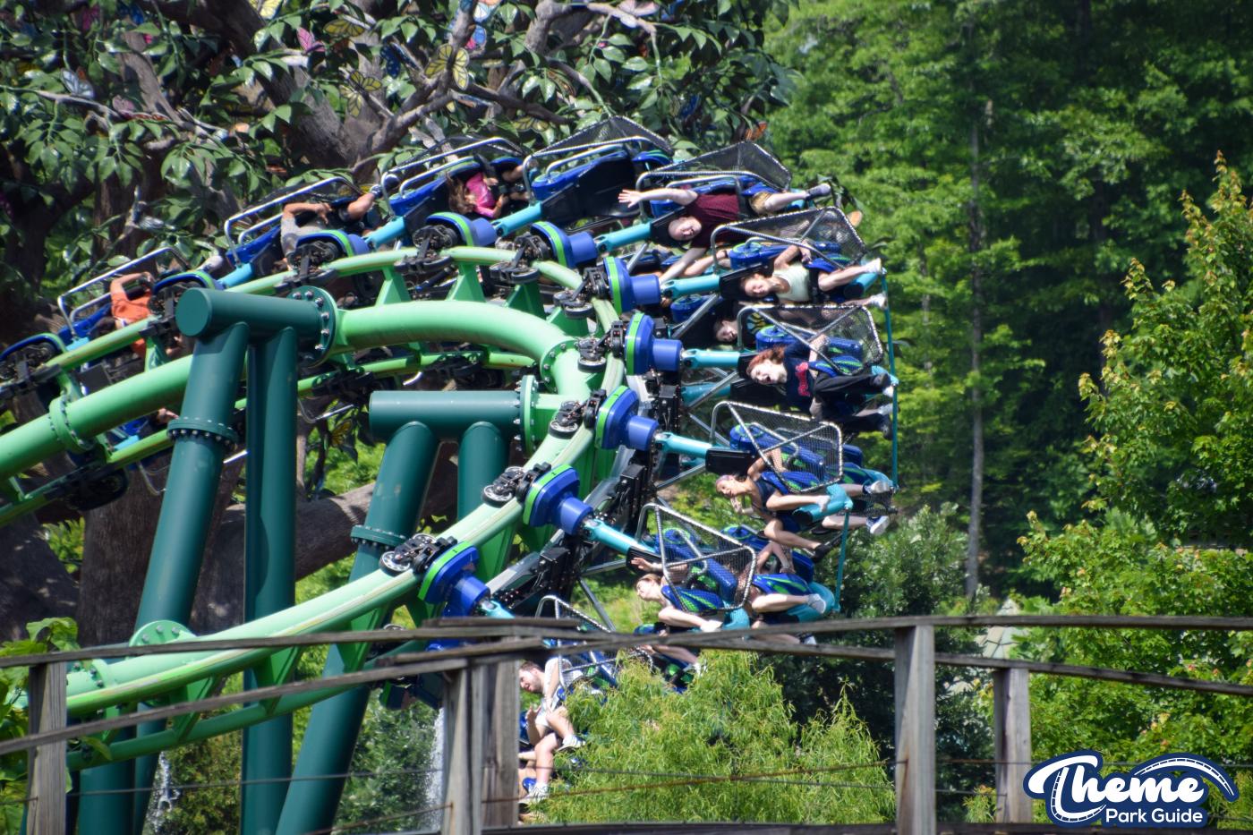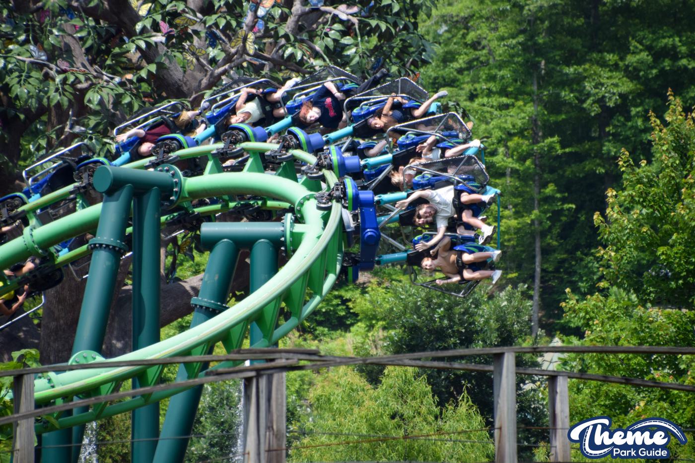 Dragonflier is a smooth, family-friendly suspended coaster found in the Wildwood Grove area. The trains hang beneath the track, swooping through low-to-the-ground curves, tunnels, and graceful maneuvers that imitate a dragonfly gliding over water. Its approachable speed and beautiful woodland setting make it a relaxing yet exciting ride.