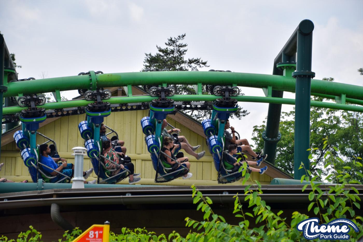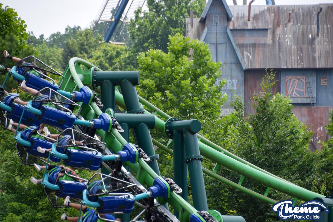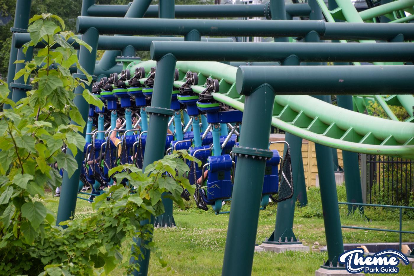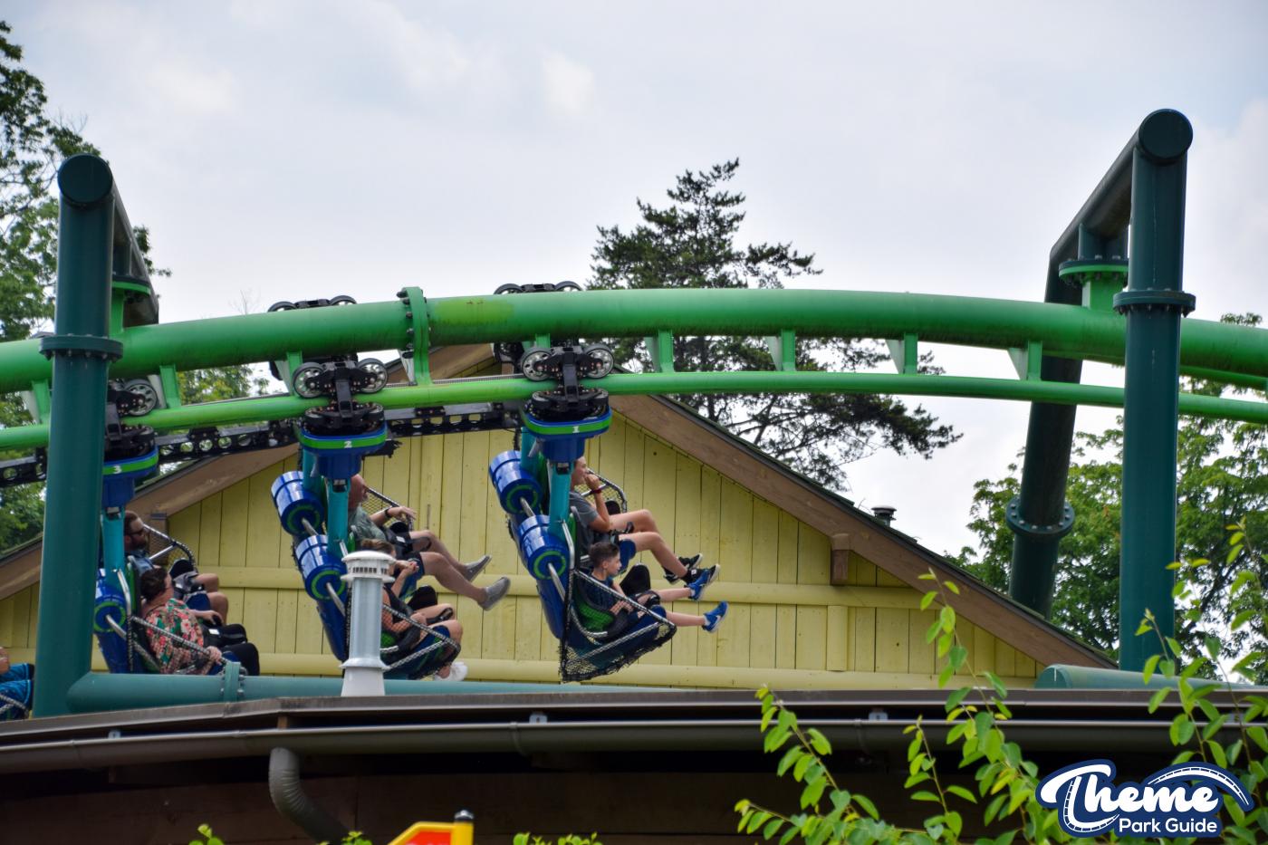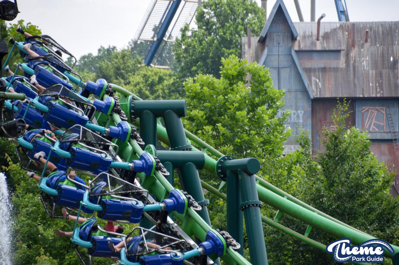 Dragonflier is a smooth, family-friendly suspended coaster found in the Wildwood Grove area. The trains hang beneath the track, swooping through low-to-the-ground curves, tunnels, and graceful maneuvers that imitate a dragonfly gliding over water. Its approachable speed and beautiful woodland setting make it a relaxing yet exciting ride.