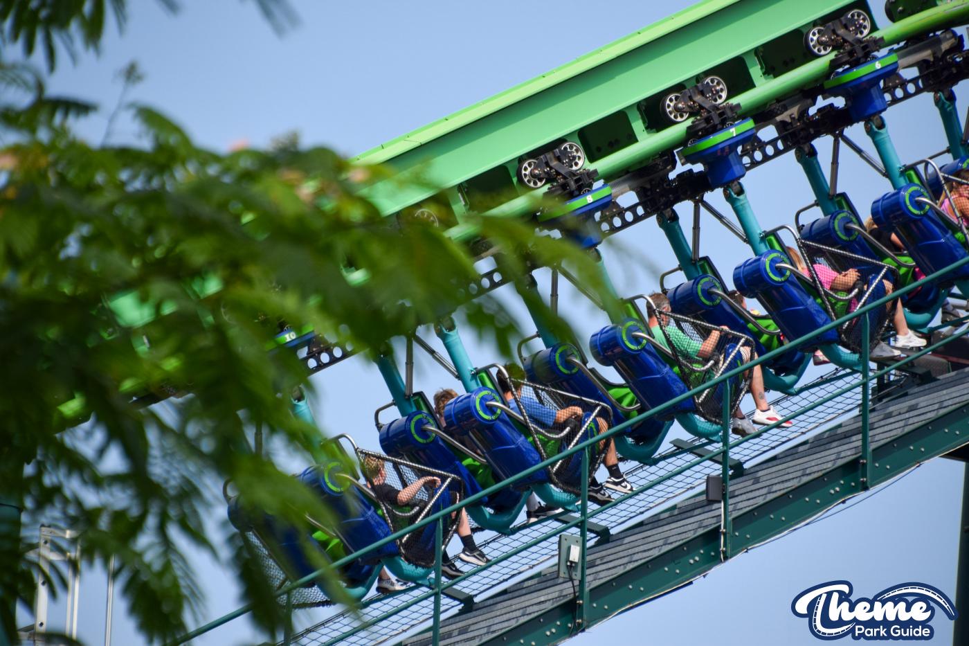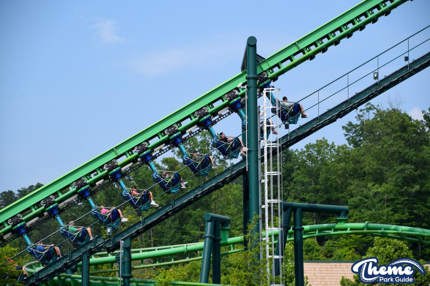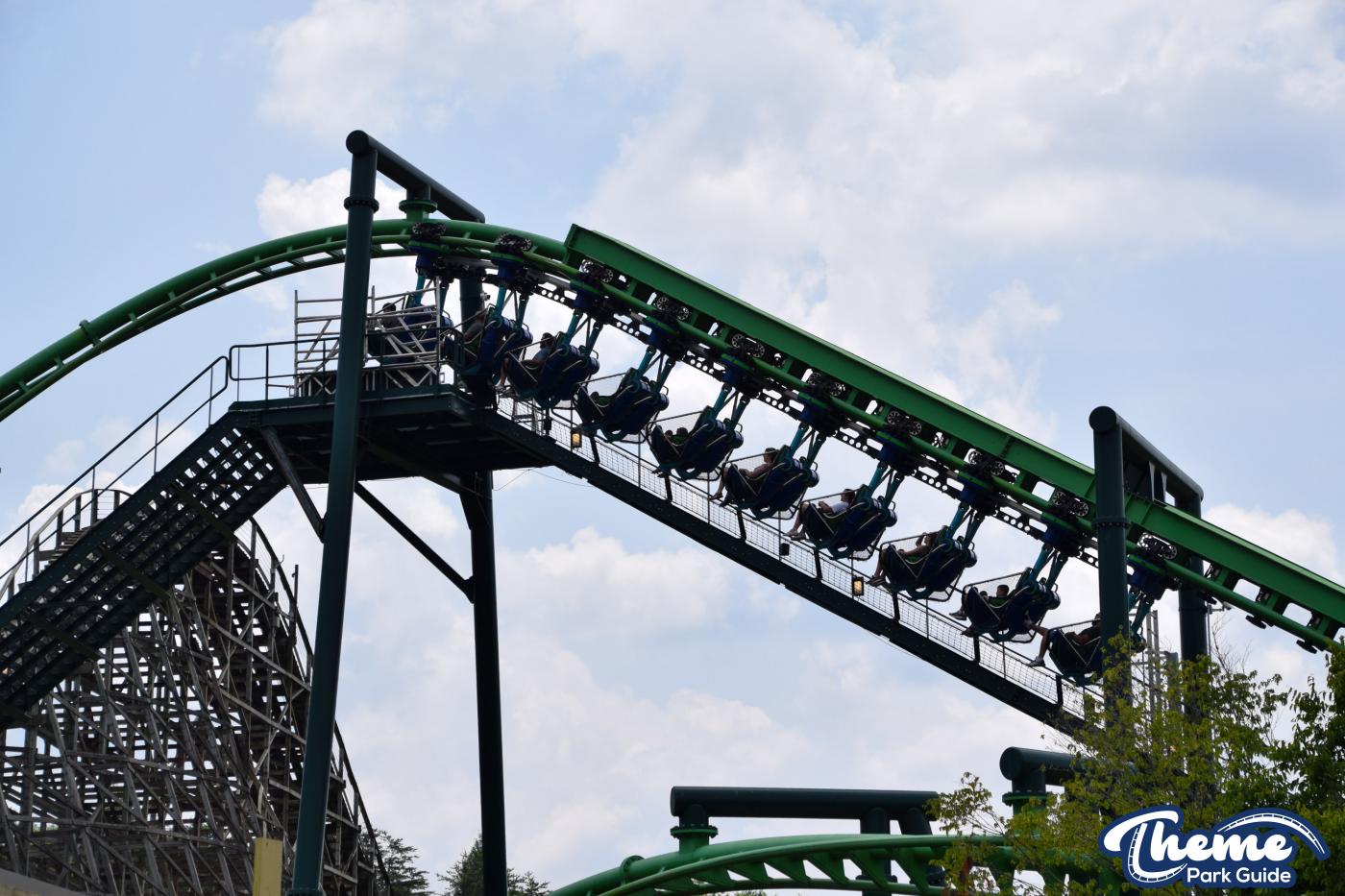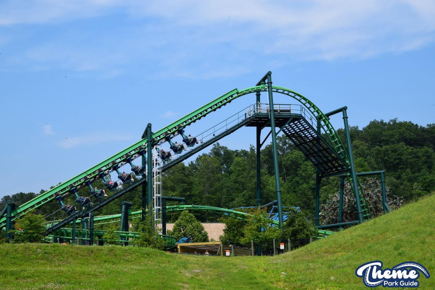 Dragonflier is a smooth, family-friendly suspended coaster found in the Wildwood Grove area. The trains hang beneath the track, swooping through low-to-the-ground curves, tunnels, and graceful maneuvers that imitate a dragonfly gliding over water. Its approachable speed and beautiful woodland setting make it a relaxing yet exciting ride.
