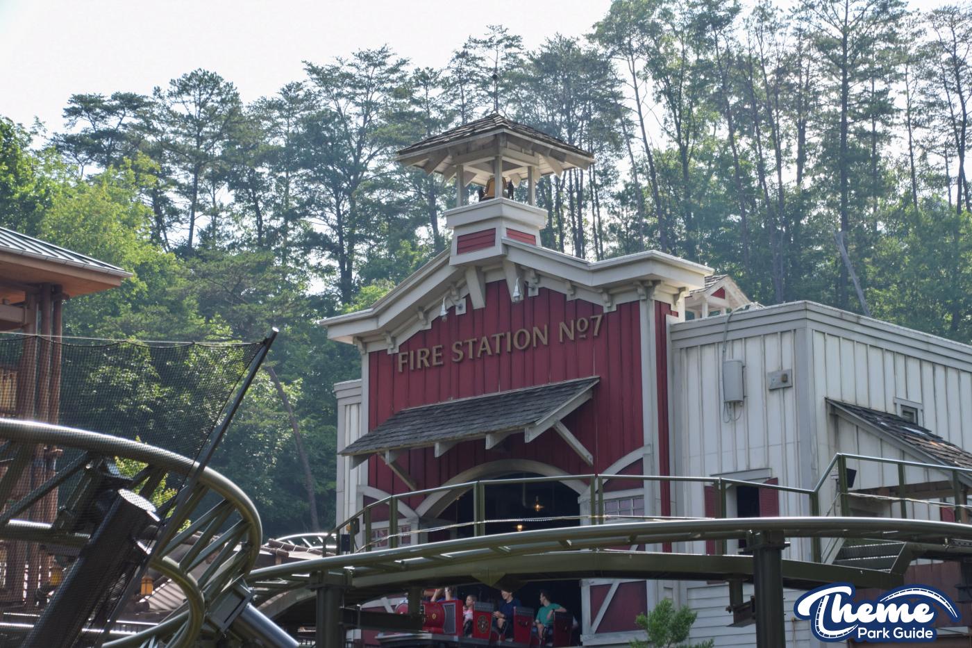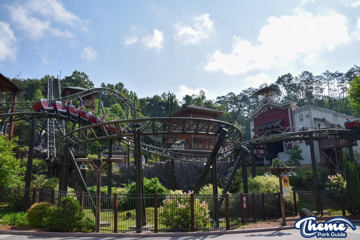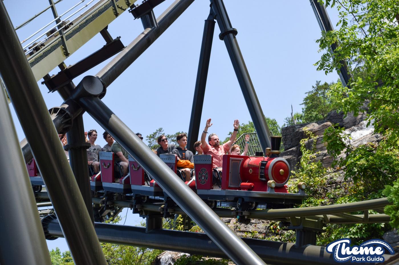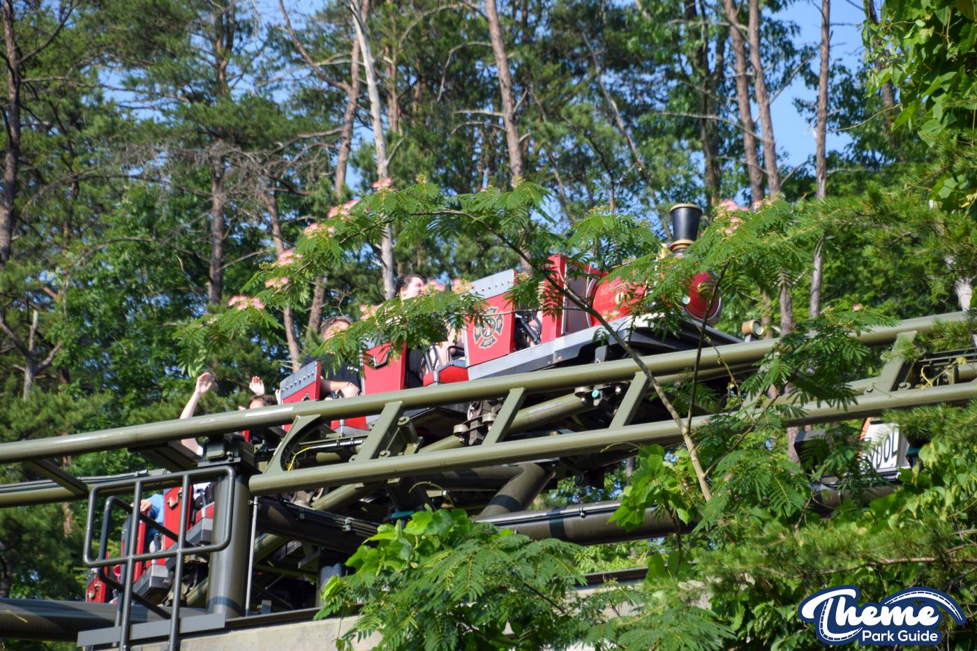 FireChaser Express is a family-thrill coaster themed around volunteer firefighters and explosive emergencies. Riders launch forward from the station, zooming through mild airtime hills and scenic structures before arriving at a surprise story moment. From there, the coaster launches backward, sending guests racing in reverse through the rest of the course. Its dual-direction layout makes it fun and unpredictable for all ages.