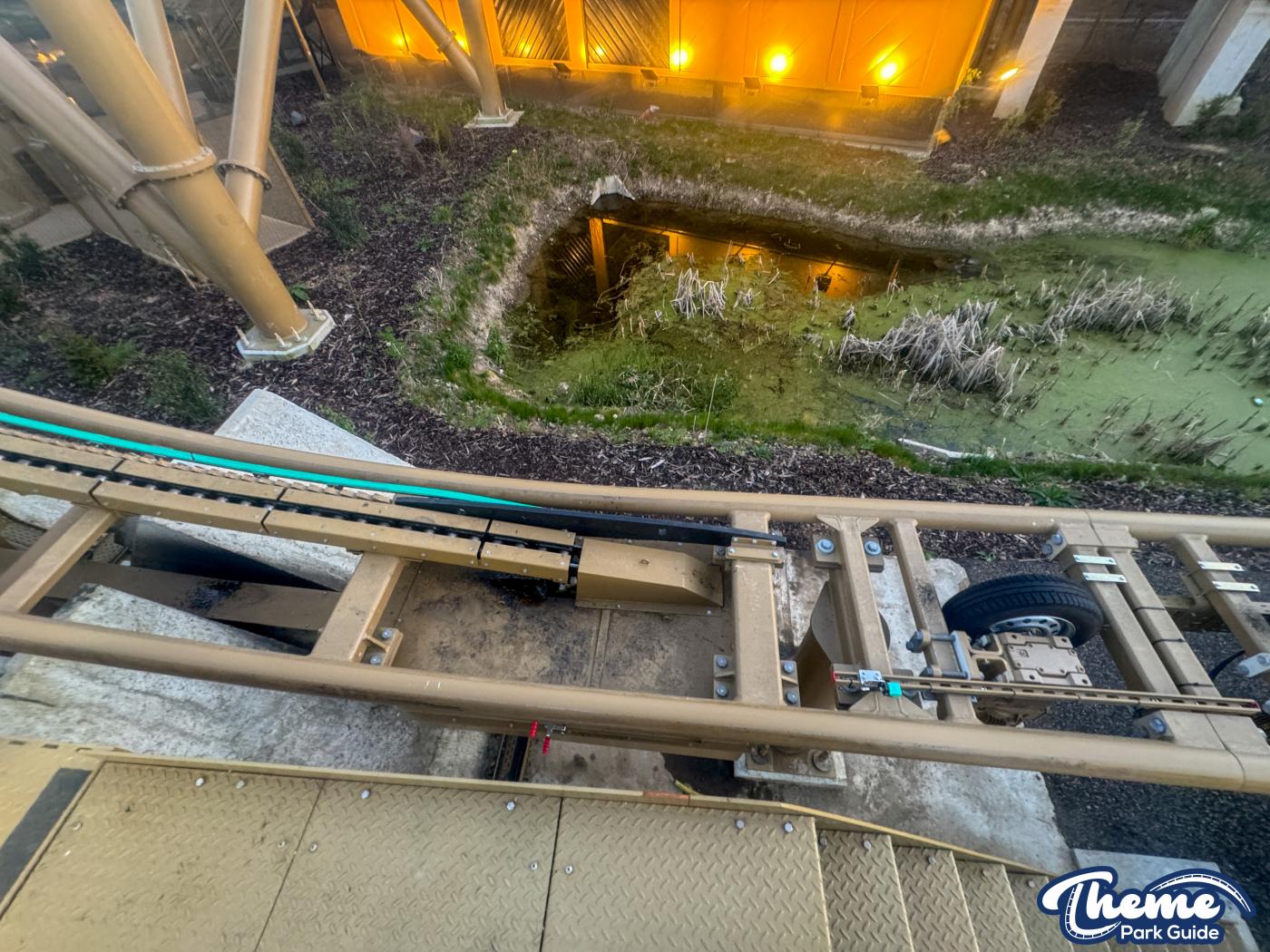 Stored on a platform next to the station, we spotted Mack-branded water dummies, offering a rare look at the testing elements used during the ride's development.
