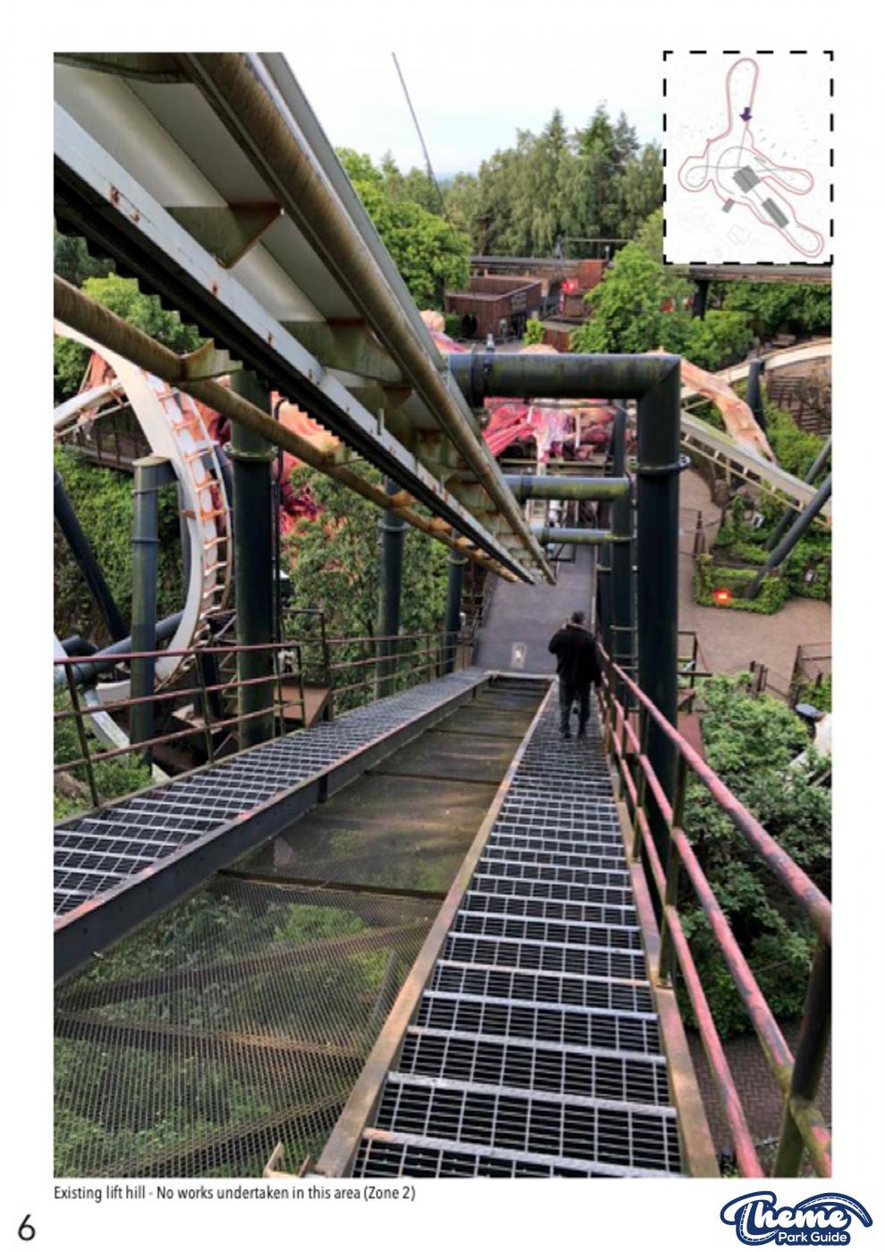 In the proposed works plan, it is shown that all of the track layout will be replaced with the exception of the brake run, station, and lift hill. As well as that, several foundations will be strengthened or even having additional foundations added. There will be no changes to any other part of the ride, apart from minor theming restorations.