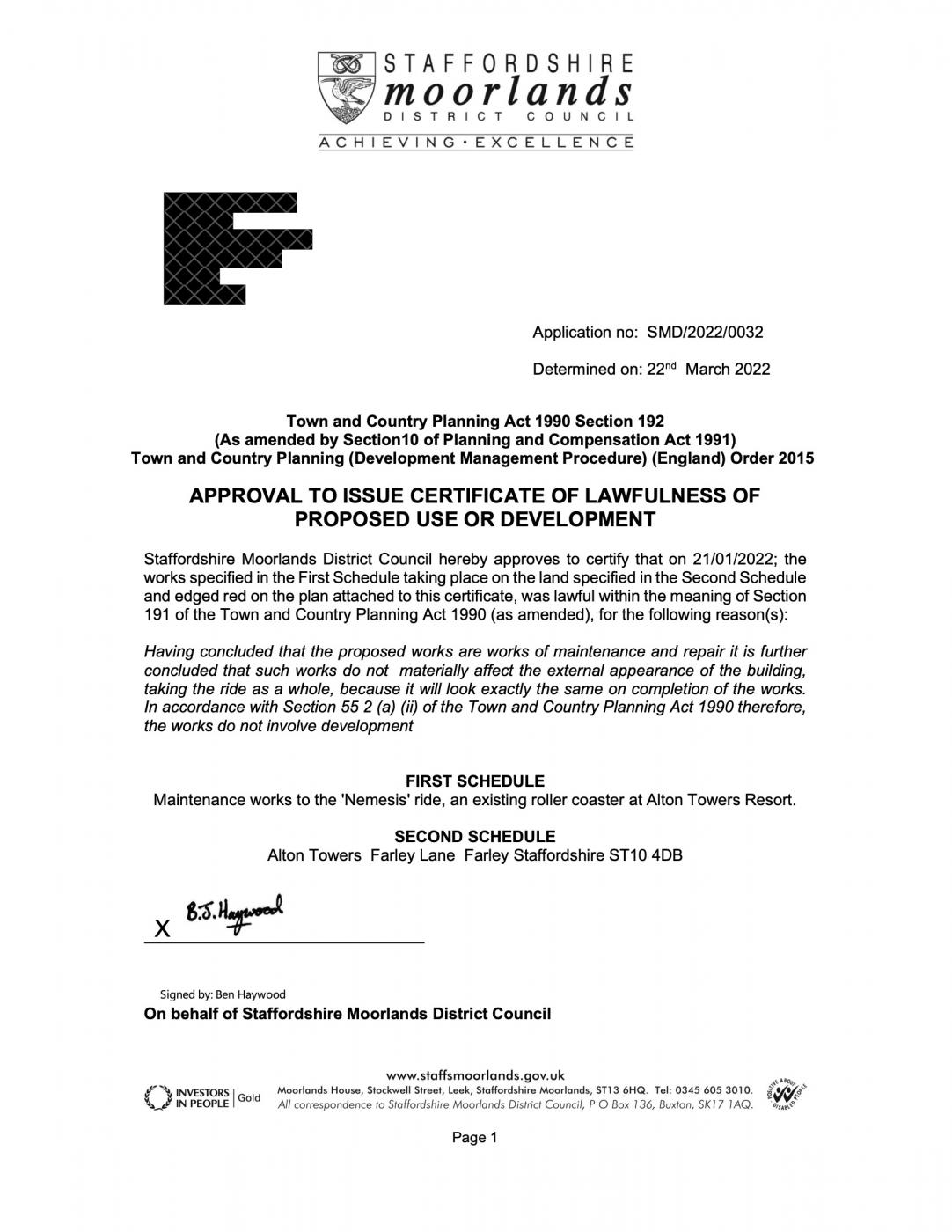 "The application seeks to confirm the lawfulness of maintenance works to the 'Nemesis' ride, an existing roller coaster at Alton Towers Resort."