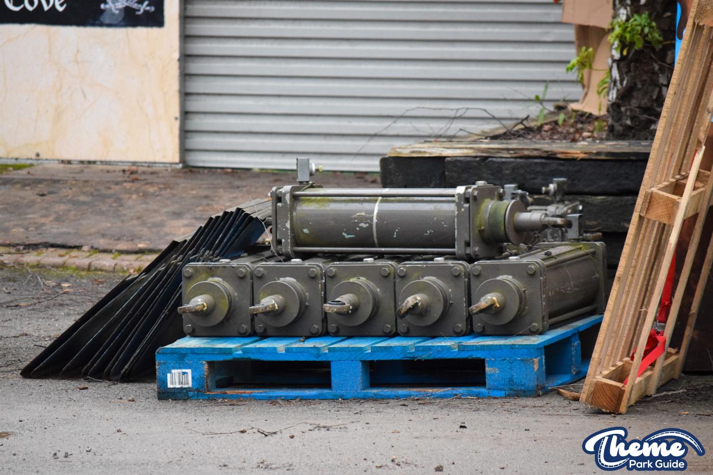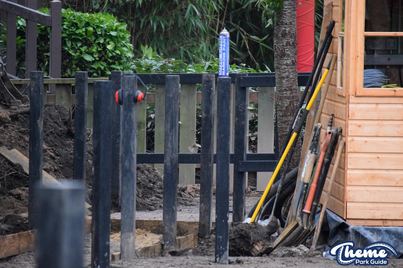 Since our last look at the attraction, the main centre of the ride has been reinstalled with cables and two of the arms for the ride installed. Motors, hydraulic cylinders and more arms for the ride can be spotted around the area. However, the repainted cars for the ride are yet to be seen. Two cabins have also been installed in the area, one for the operators booth and the other for the rides PLC’s and ride hardware. Fence posts have also been installed behind the ride, for the rides queue line and boundary fence. Red, green, blue and yellow fence posts can be seen sat on the side ready to make the area more colourful, matching the rides new IP.