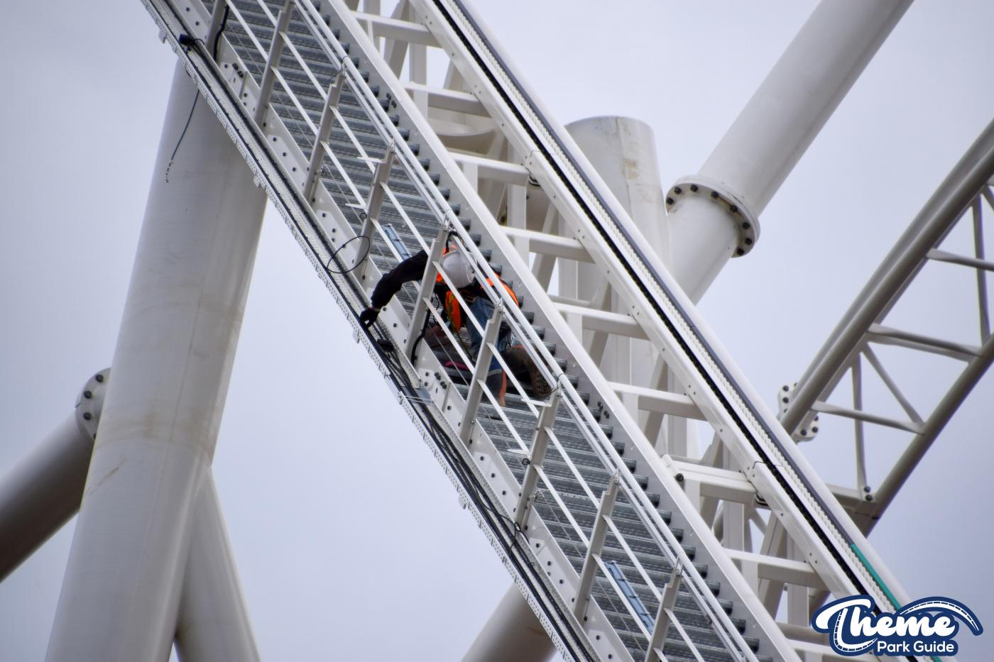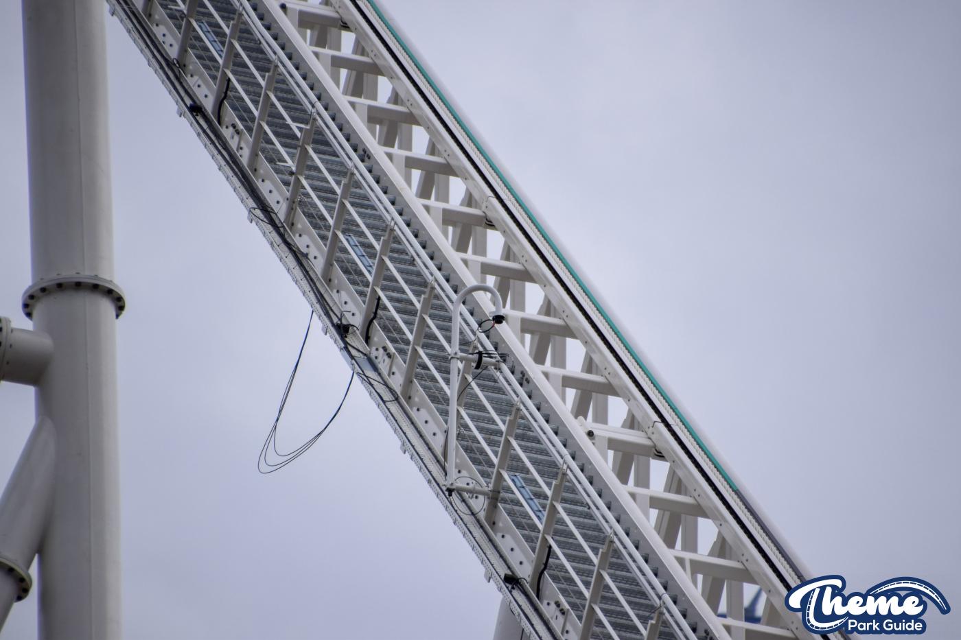 Speakers have also been installed on the lift hill for the rollercoaster. White speakers have been installed as the rollercoaster gets higher and then gold ones have been installed where the track is still gold. A very simple touch but it's great to see attention to detail. Work on installing cameras up the lift hill is also being worked on. Installing anything at that height can't be easy.