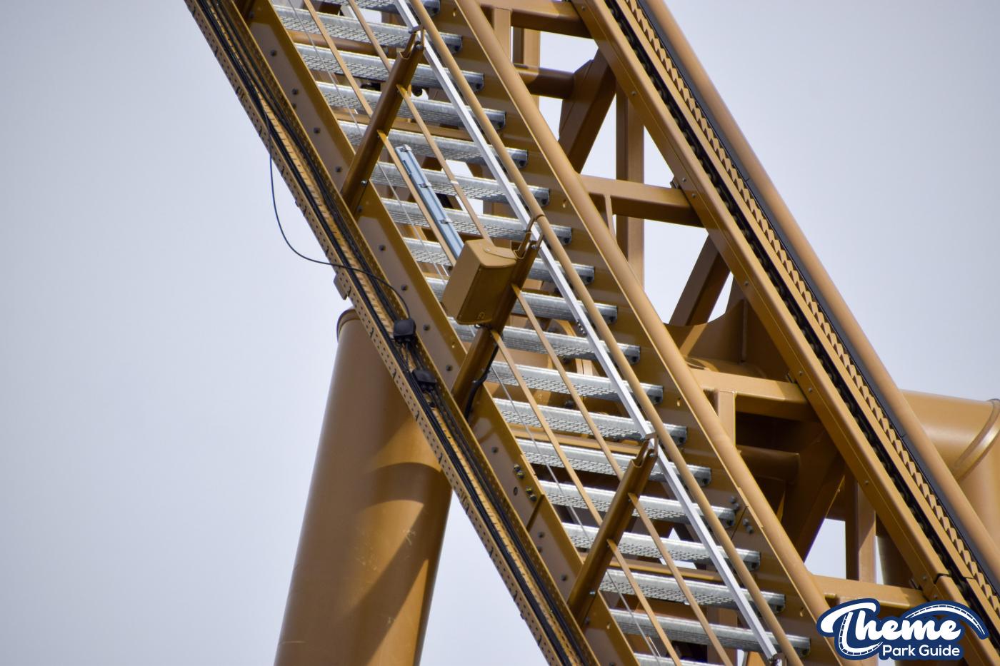 Some parts for Hyperia are being stored in the storage yard next to Trailers. The airgates for the rollercoaster can be spotted along with parts for the lift hill chain mechanism. The airgates for the ride have a jet-black colour scheme which we love.