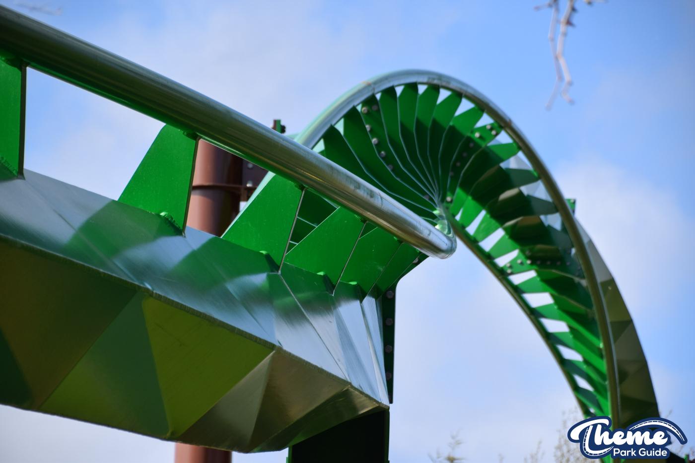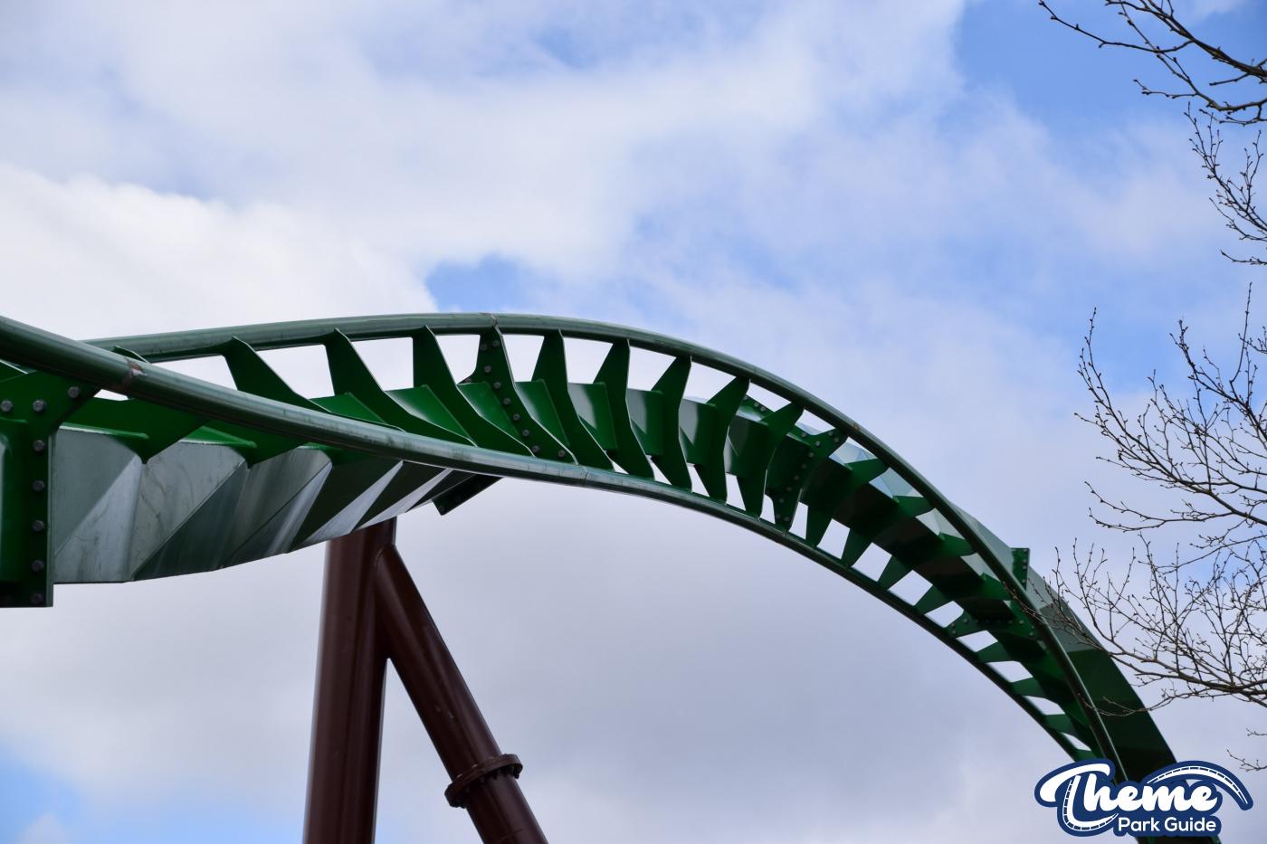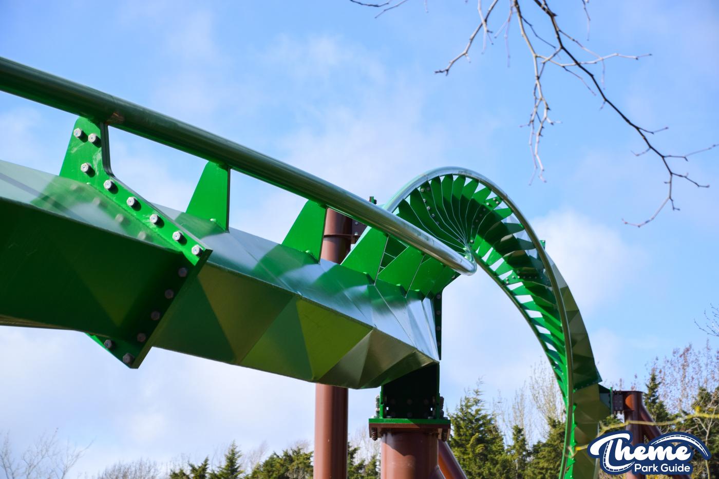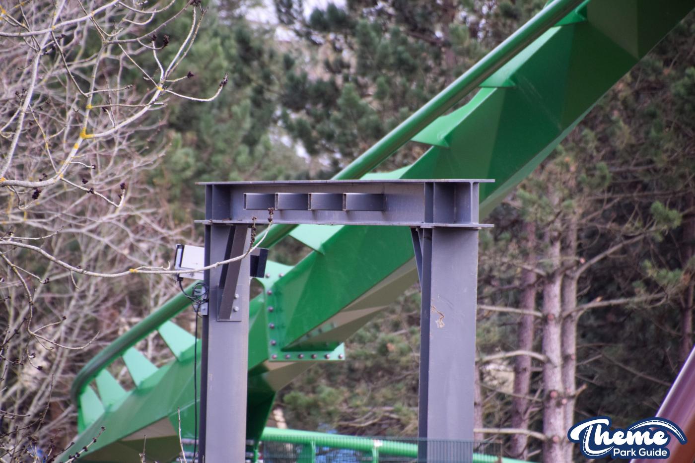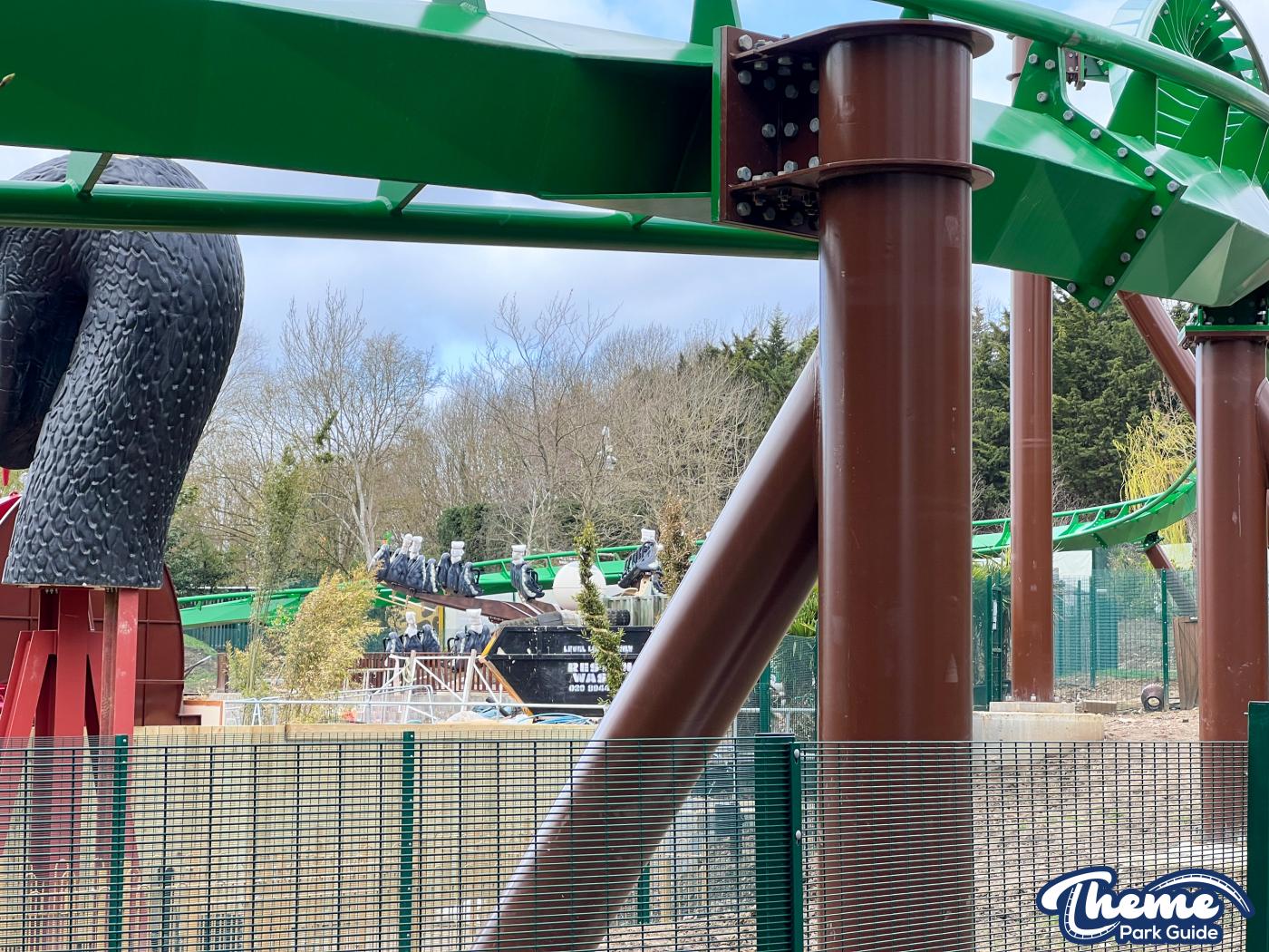 Theming around Mandrill Mayhem consists of many trees and plants, however, we've spotted a leg chopper effect has been installed around the circuit near the second launch for the ride. Located on both sides of the track, some spikes coming out of the ground have been installed.