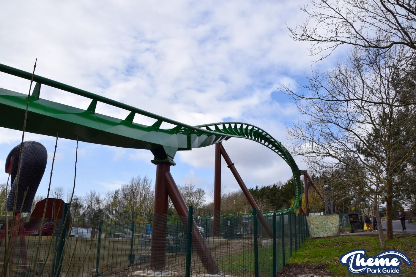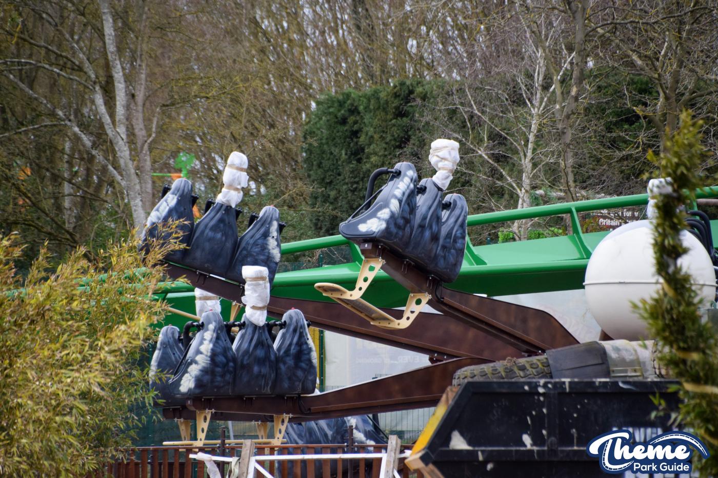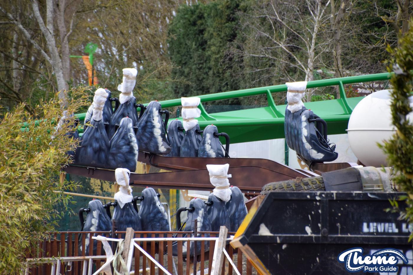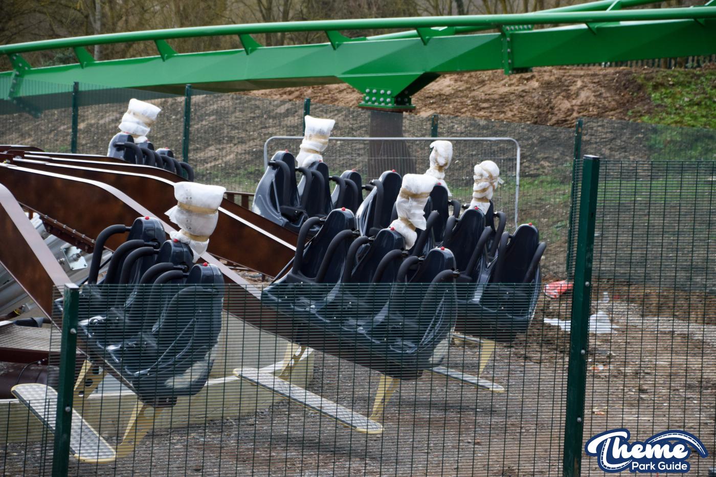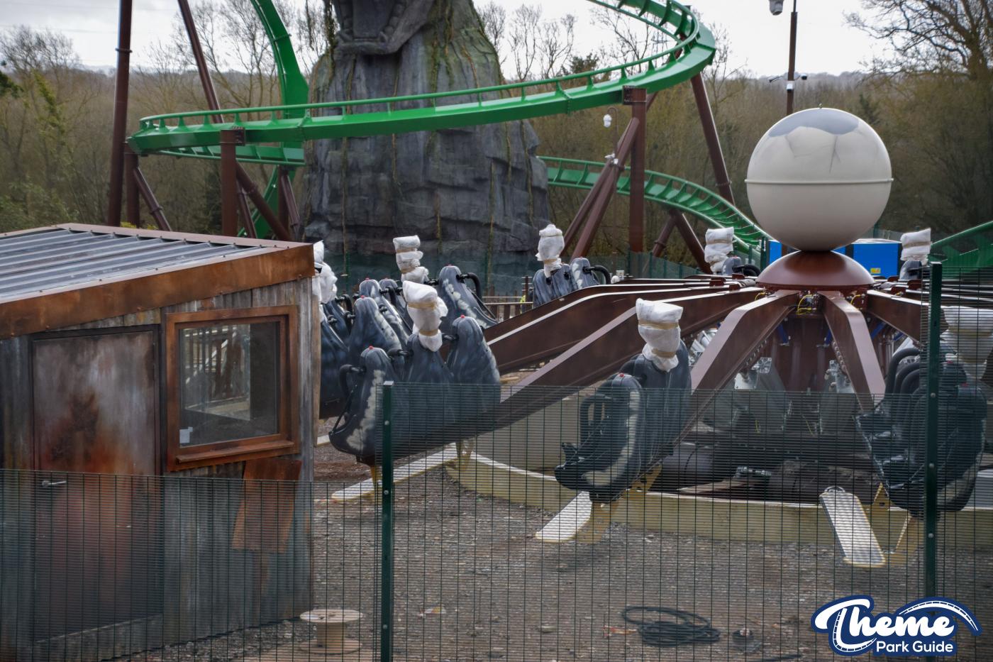 Work on Dragons Fury continues with the cars for the ride spotted around the area. With some wrapped up and one is on the track ready for testing. The old maintenance shed for the ride has also been replaced with a huge new purpose-built maintenance building. All is still work in progress but it should be finished by opening day.