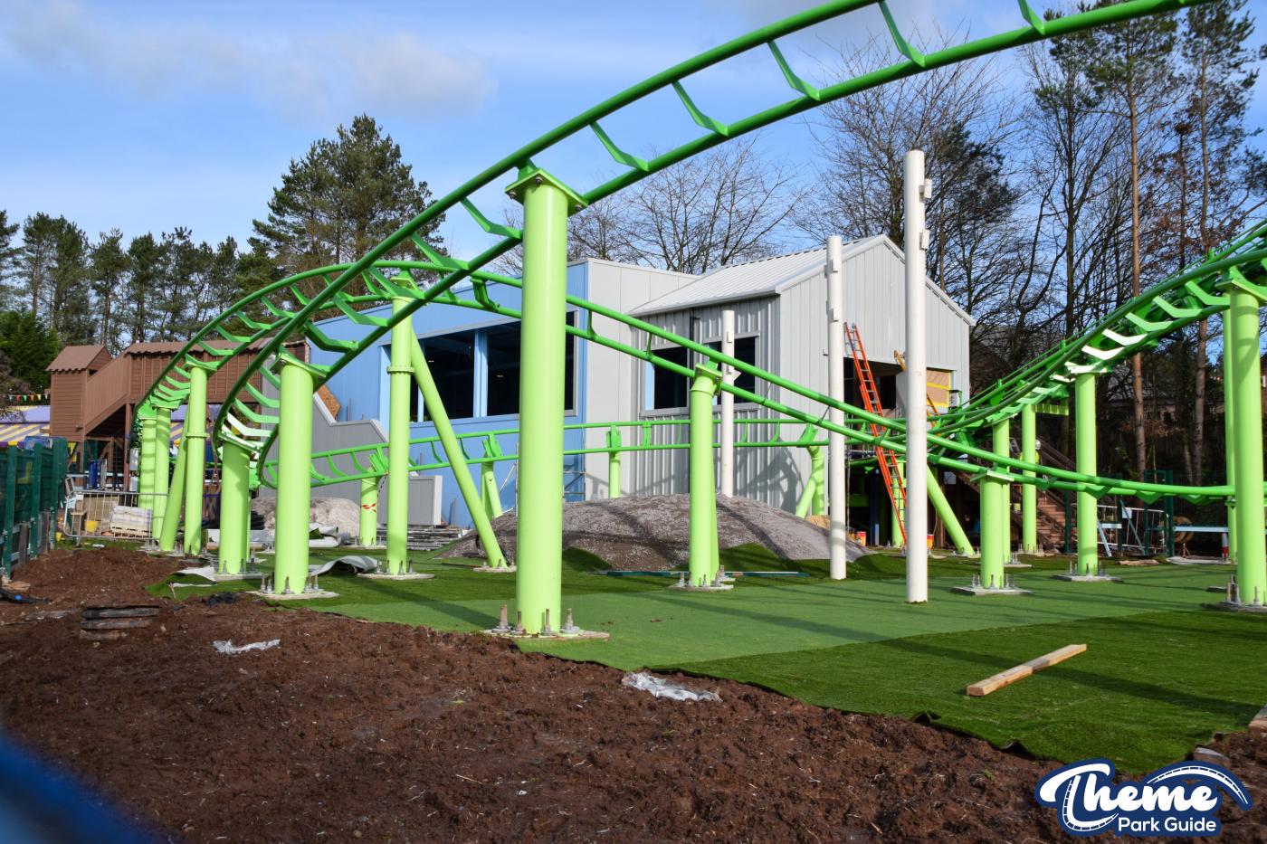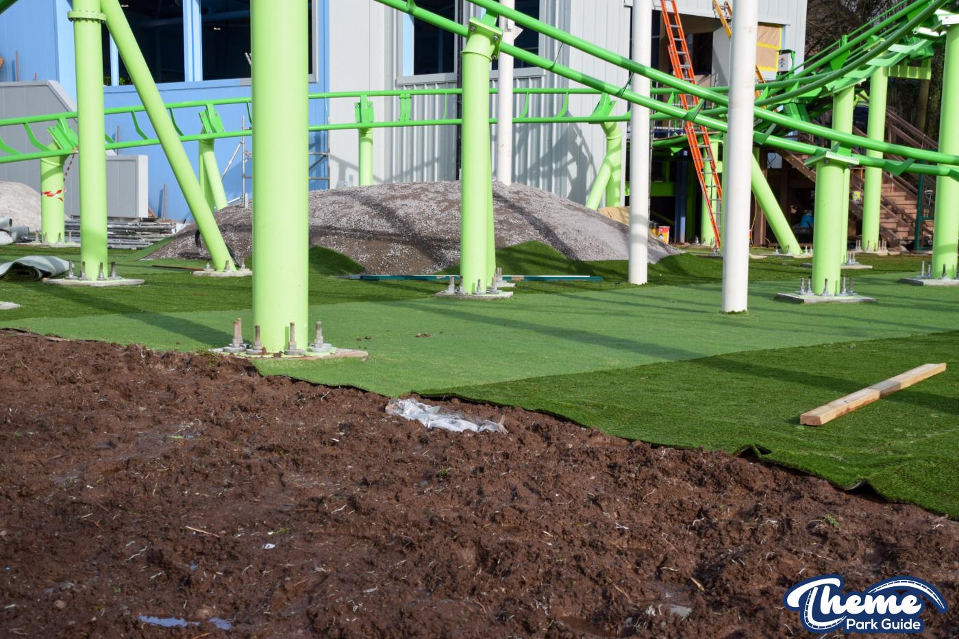 The pathway to the ride remains closed, meaning guests currently need to walk through the Big Show Funtime Arena to access other attractions, but this diversion highlights just how much work is taking place. Most of the construction fencing has now been removed and replaced with a permanent ride-area fence, instantly making the space feel more complete. Grass is also being installed beneath the ride, adding a fresh and finished appearance as the area begins to take shape.