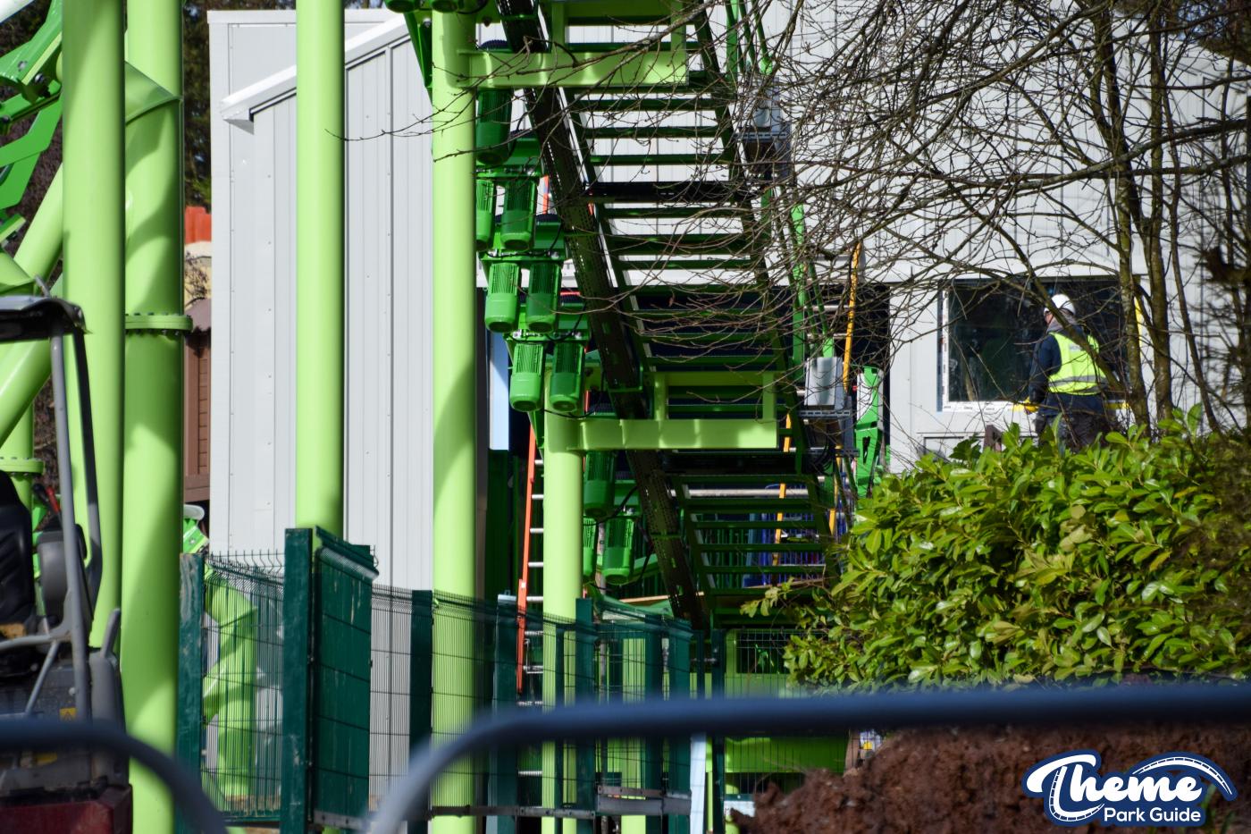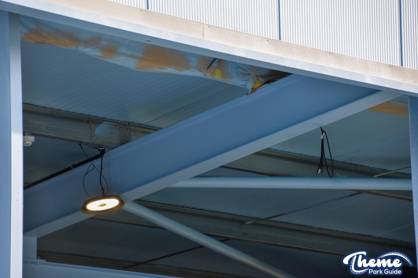 The ride’s exit bridge has also been put into place and looks really smart. We’re particularly intrigued to see what theming or vinyl graphics will be added to both the station and the bridge in the coming weeks.