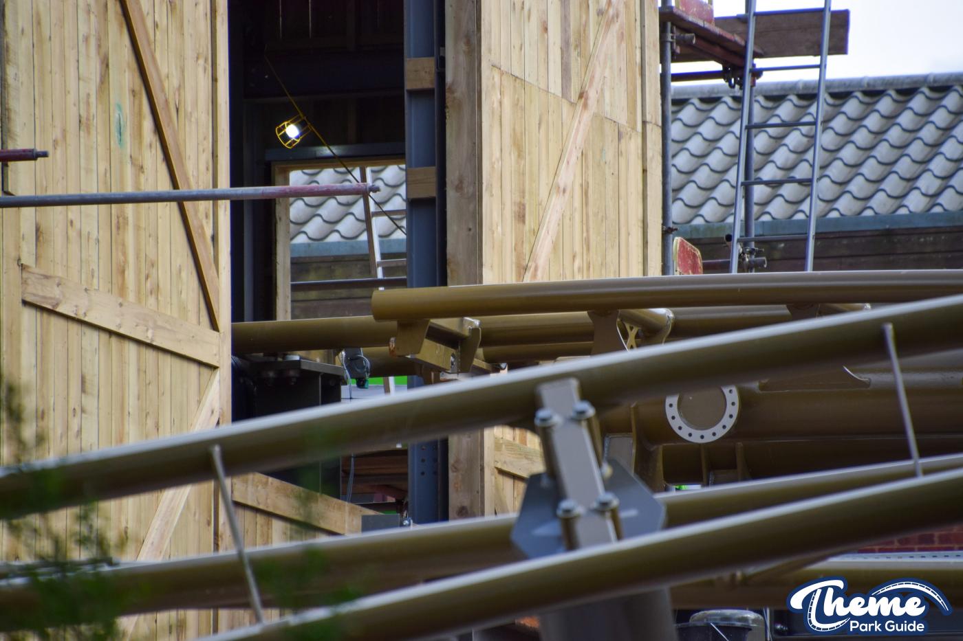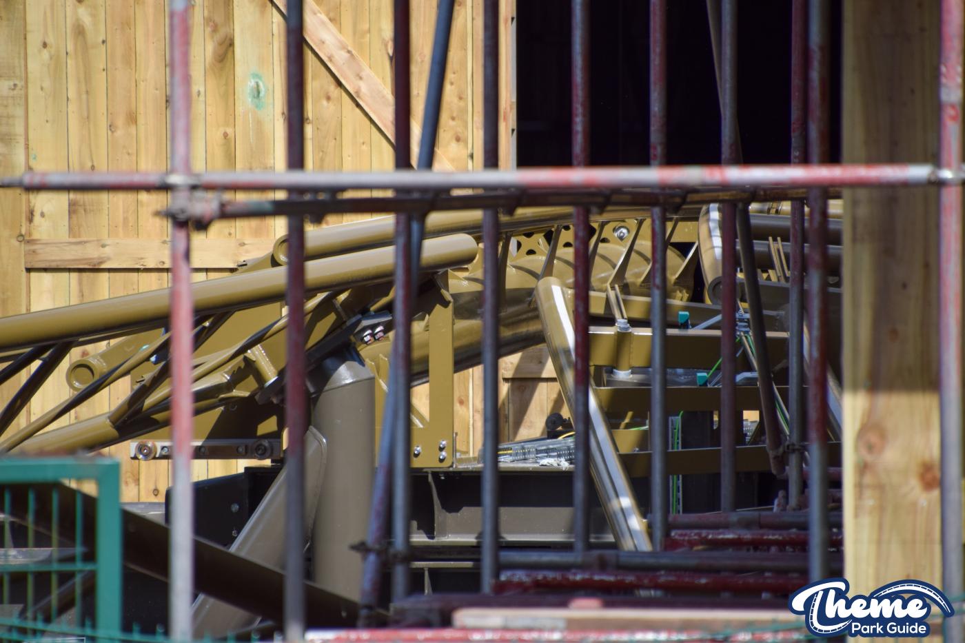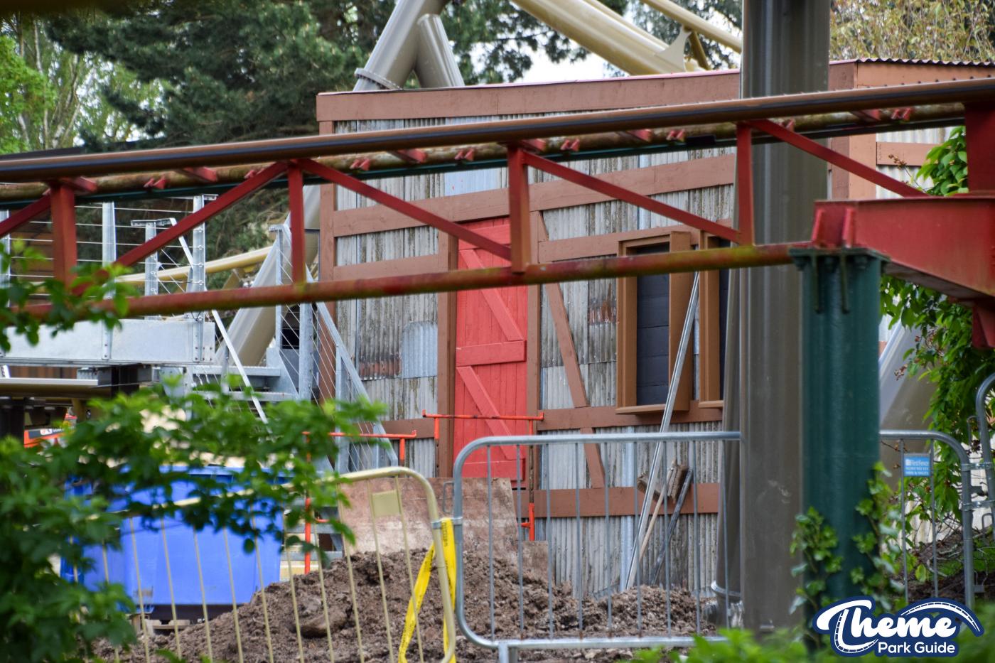 Inside the station for the ride, a control booth has been built. A huge tower at the front of the station can be seen standing. However, unlike the rest of the station, this structure doesn't have any theming on it yet. Could this be a bigger theming element that has not yet been lifted into place?