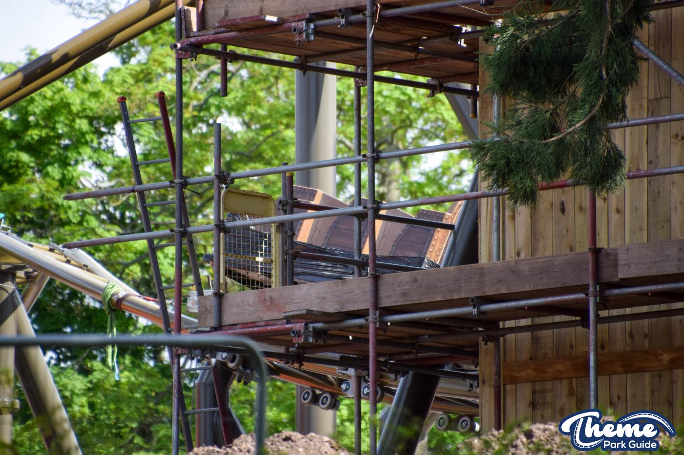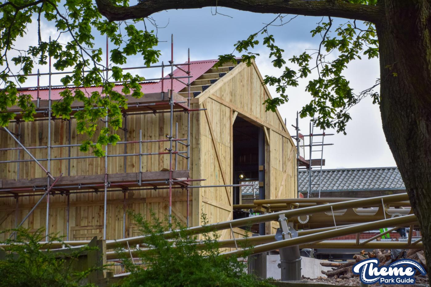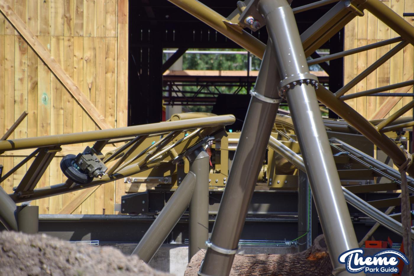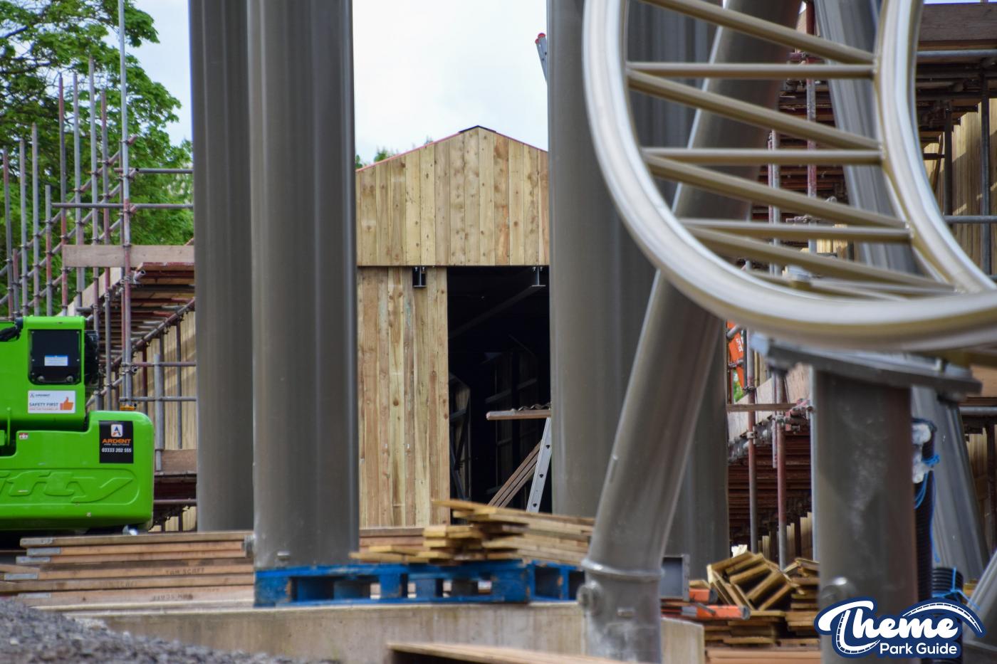 Inside the station for the ride, a control booth has been built. A huge tower at the front of the station can be seen standing. However, unlike the rest of the station, this structure doesn't have any theming on it yet. Could this be a bigger theming element that has not yet been lifted into place?