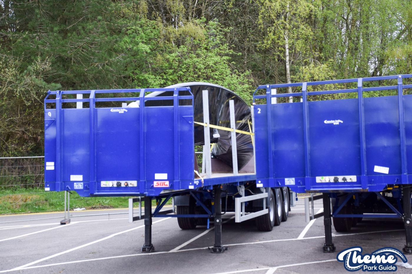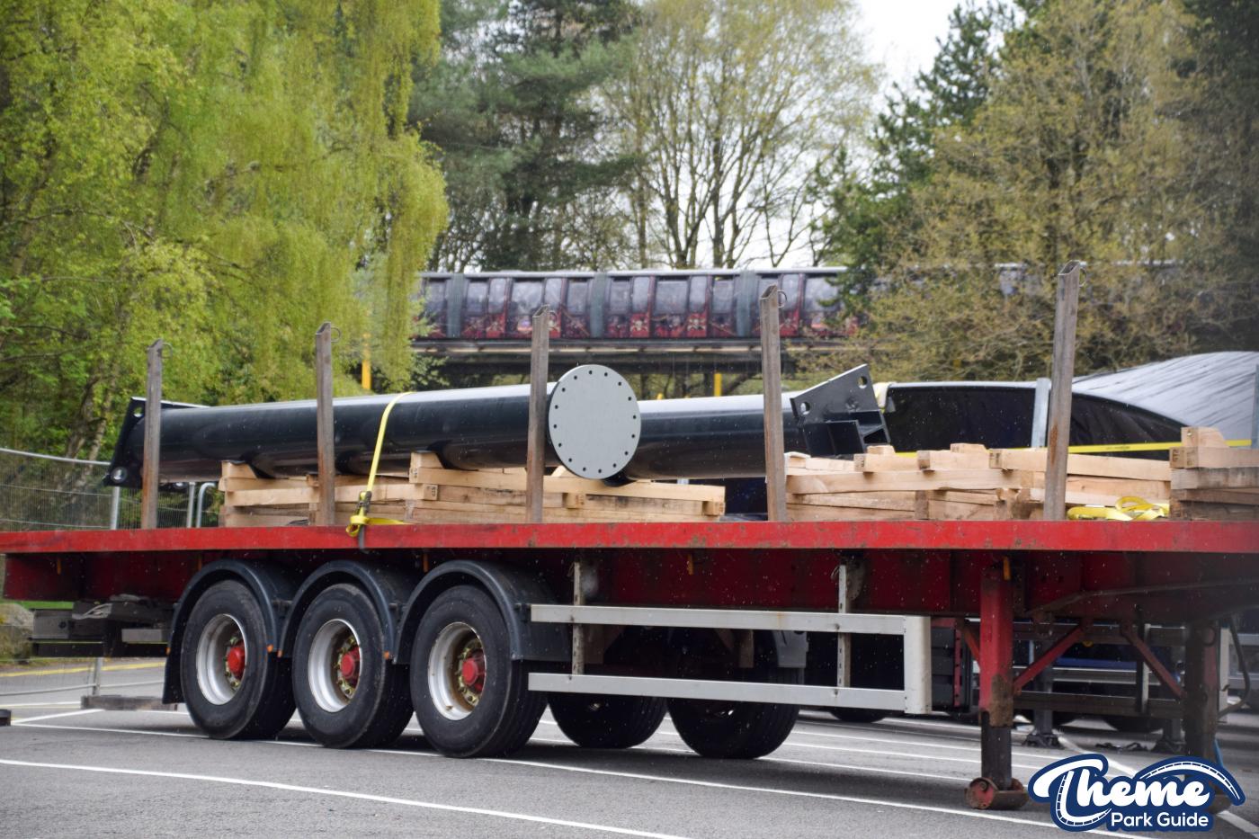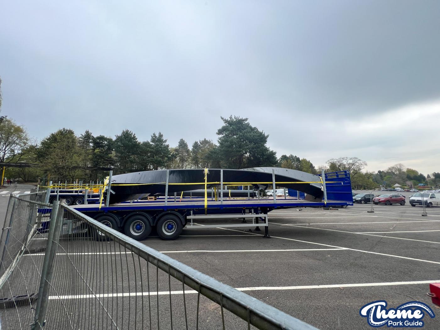 Trucks continue to arrive at Alton Towers with more sections of Nemesis track and supports. Being delivered by the Phalanx the trucks are being stored in the car park by Air. Closely guarded these trucks are shrouded by fences so no one can disturb the Nemesis experiments going on by Phalanx.