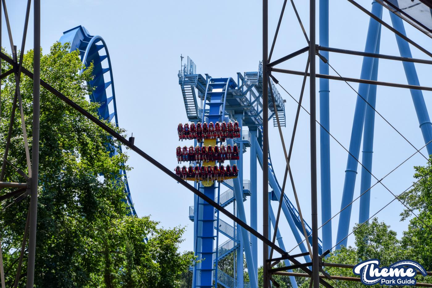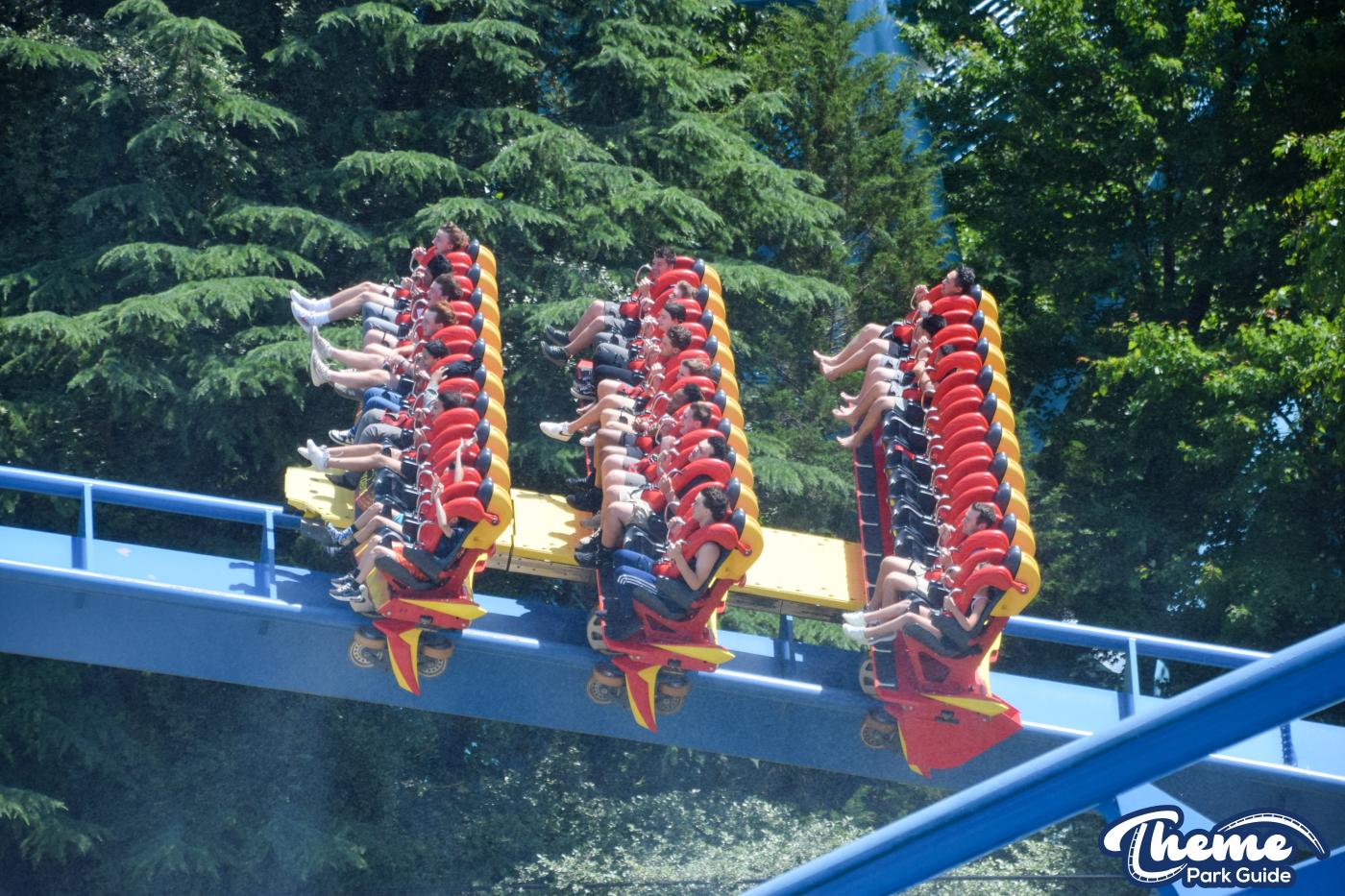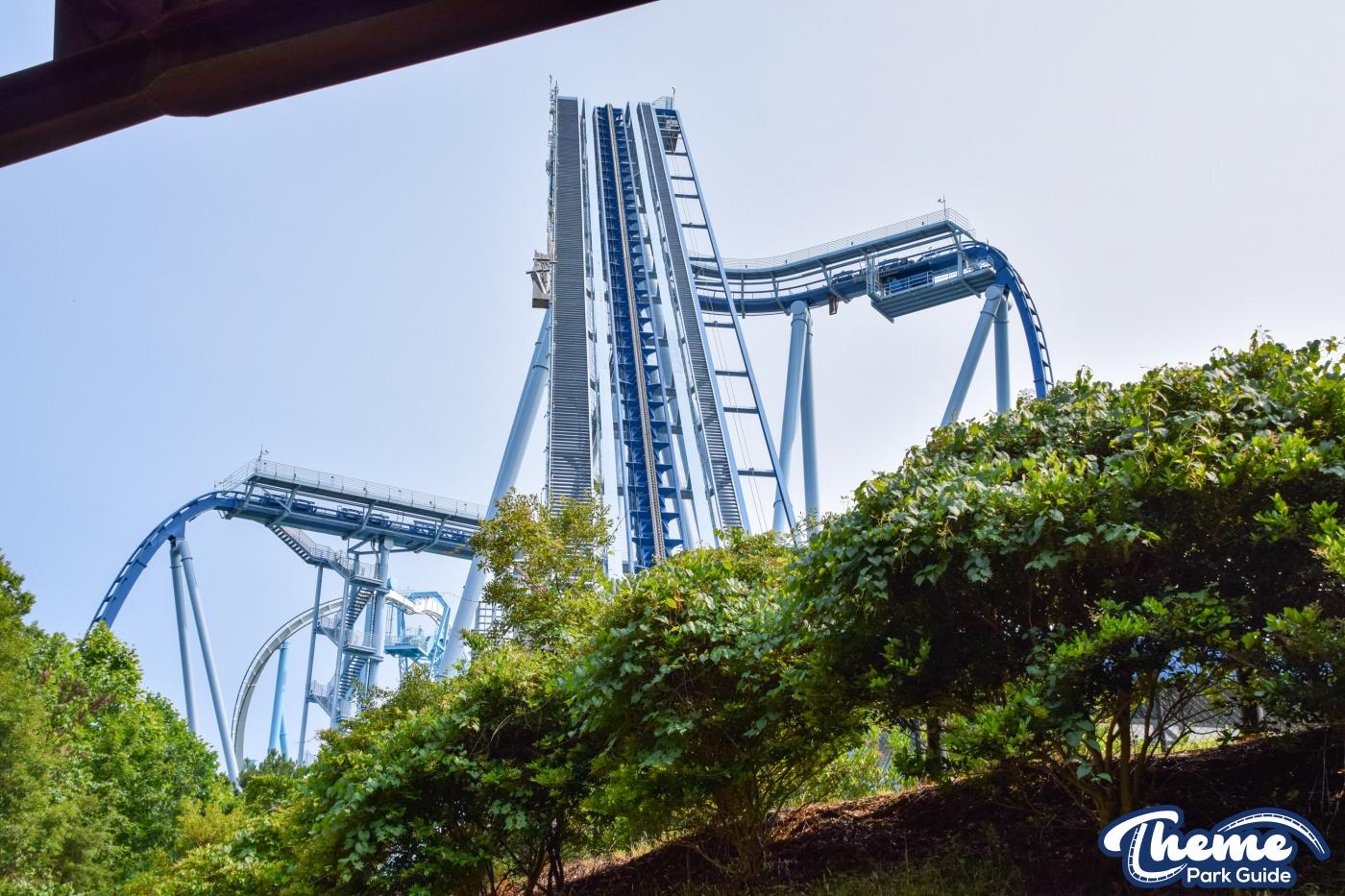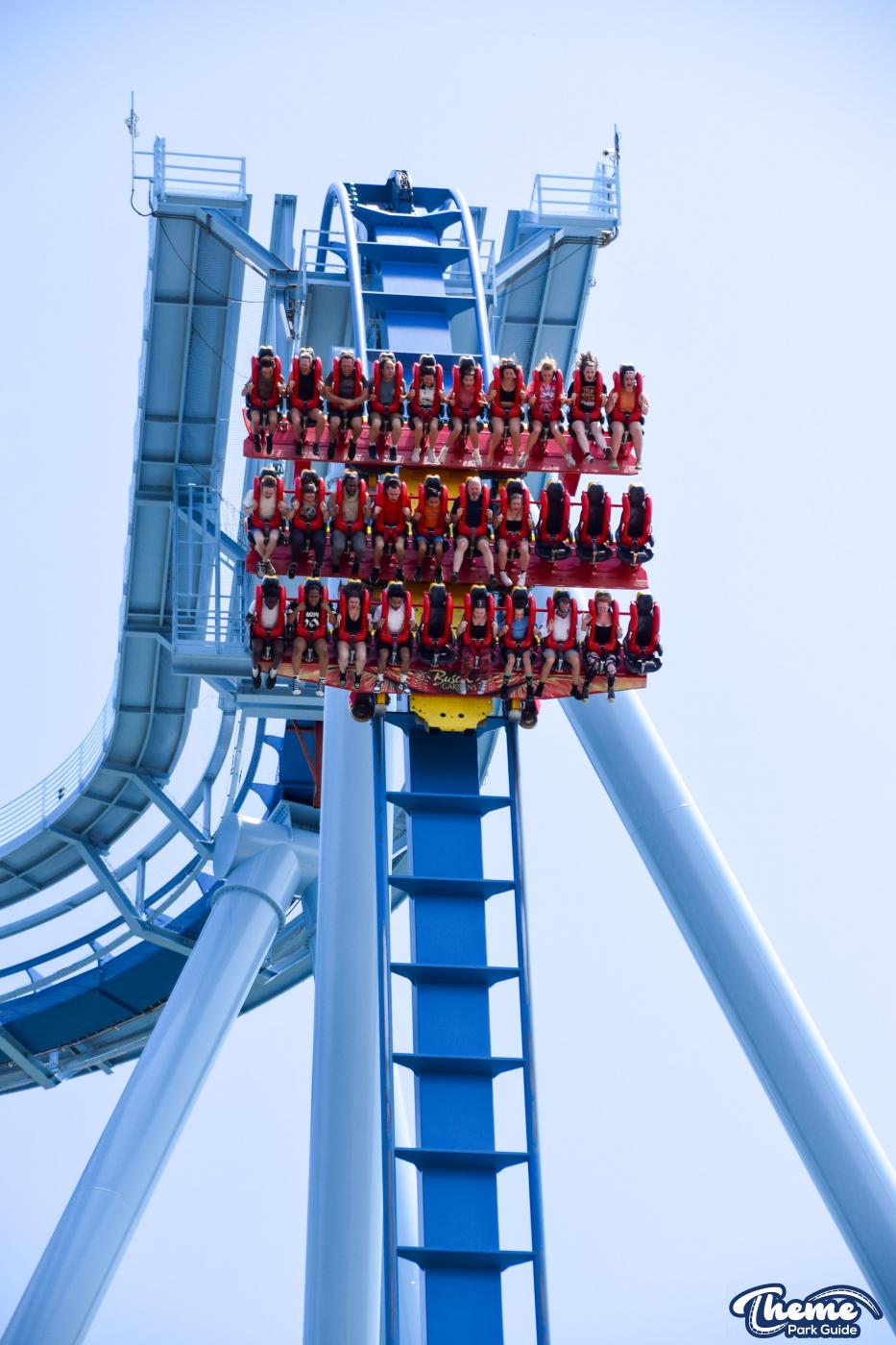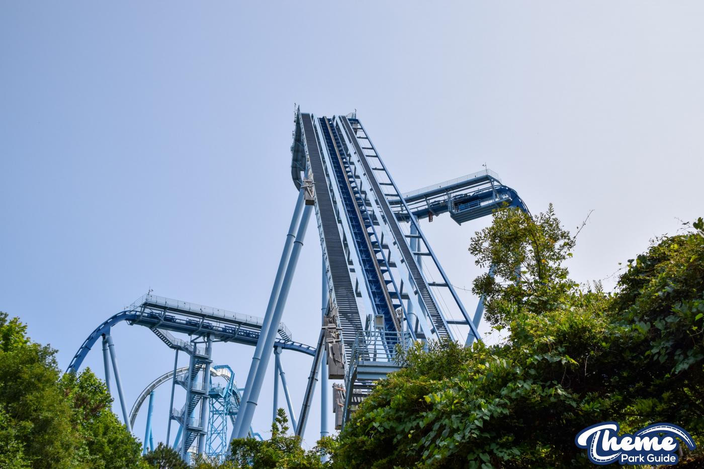 Griffon is a floorless dive coaster featuring a vertical 90-degree drop from a towering height. As the train pauses at the brink before plunging downward, riders experience dramatic anticipation followed by a swift drop, smooth inversions, and large water-skimming splash elements. The floorless design leaves riders with their legs dangling freely, enhancing the sense of exposure. Griffon’s imposing structure and theatrical first drop make it one of the park’s signature thrill machines.