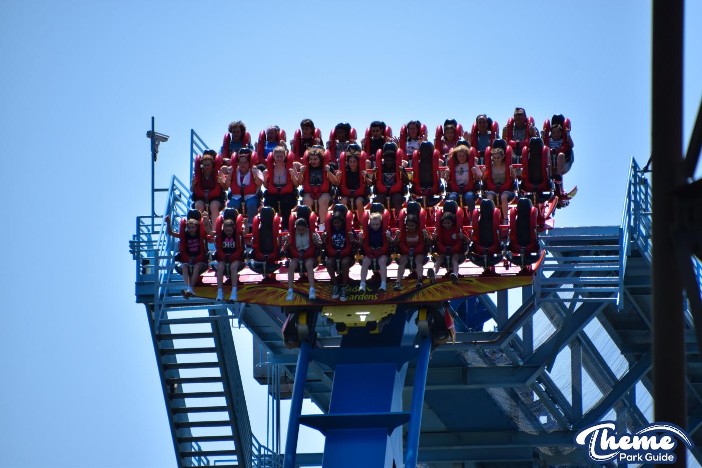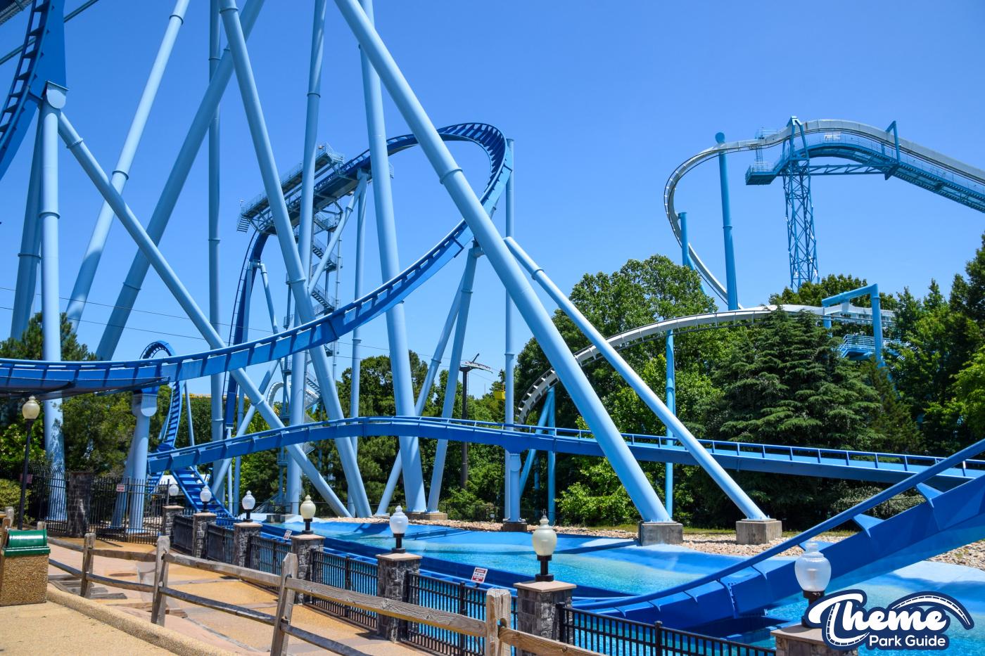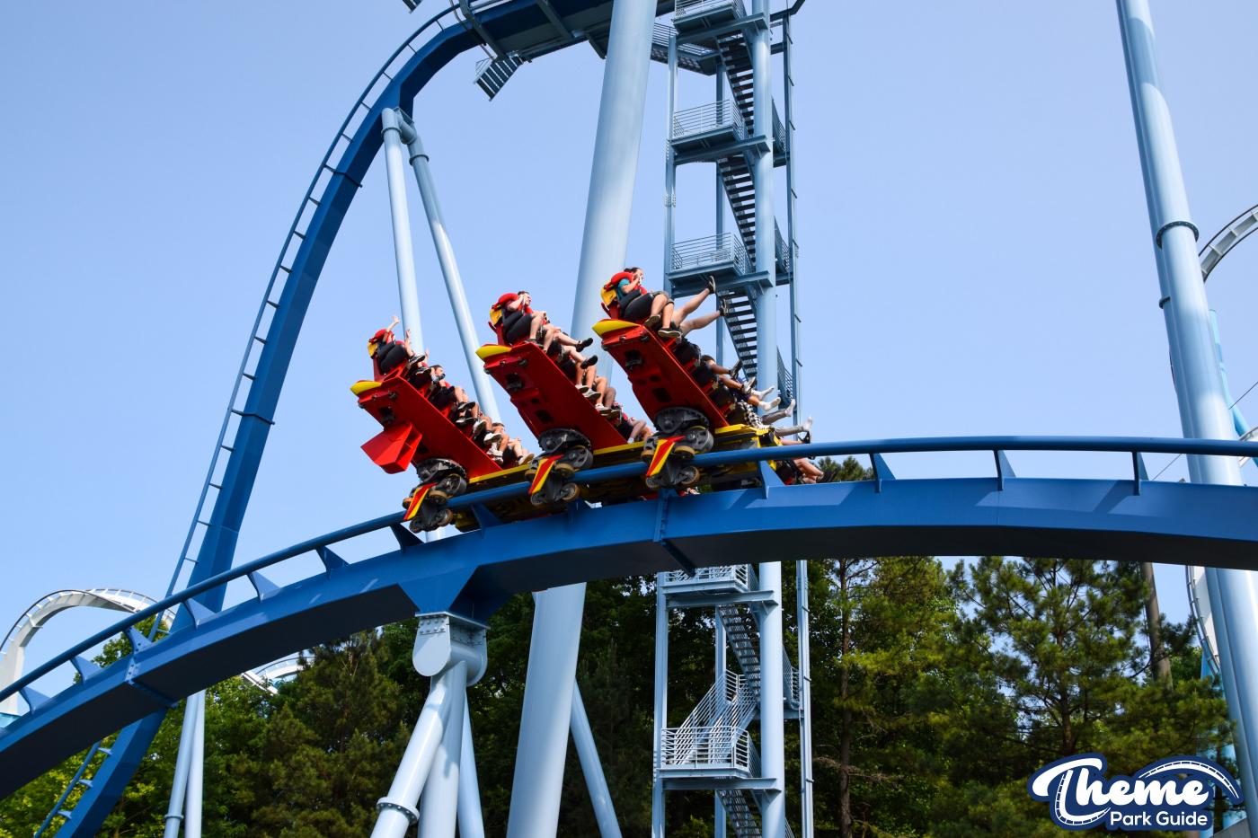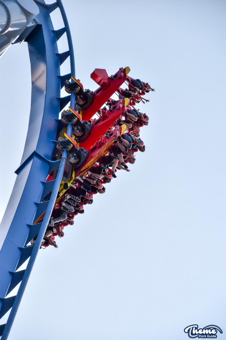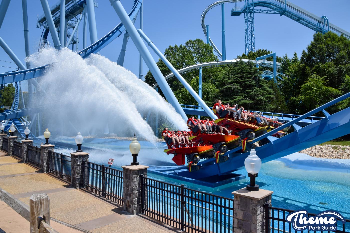 Griffon is a floorless dive coaster featuring a vertical 90-degree drop from a towering height. As the train pauses at the brink before plunging downward, riders experience dramatic anticipation followed by a swift drop, smooth inversions, and large water-skimming splash elements. The floorless design leaves riders with their legs dangling freely, enhancing the sense of exposure. Griffon’s imposing structure and theatrical first drop make it one of the park’s signature thrill machines.